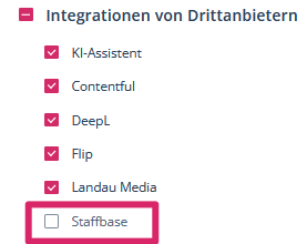 Hinweis für Administratoren: Stellen Sie sicher, dass Ihr Staffbase-Account korrekt in Scompler angebunden ist. Dann wird automatisch ein Staffbase-Content-Typ erstellt, der unter Strategie>Content-Typen zu finden und anpassbar ist. Aktivieren Sie dann den Zugang zu Staffbase für die gewünschten Benutzergruppen in den Projekteinstellungen: