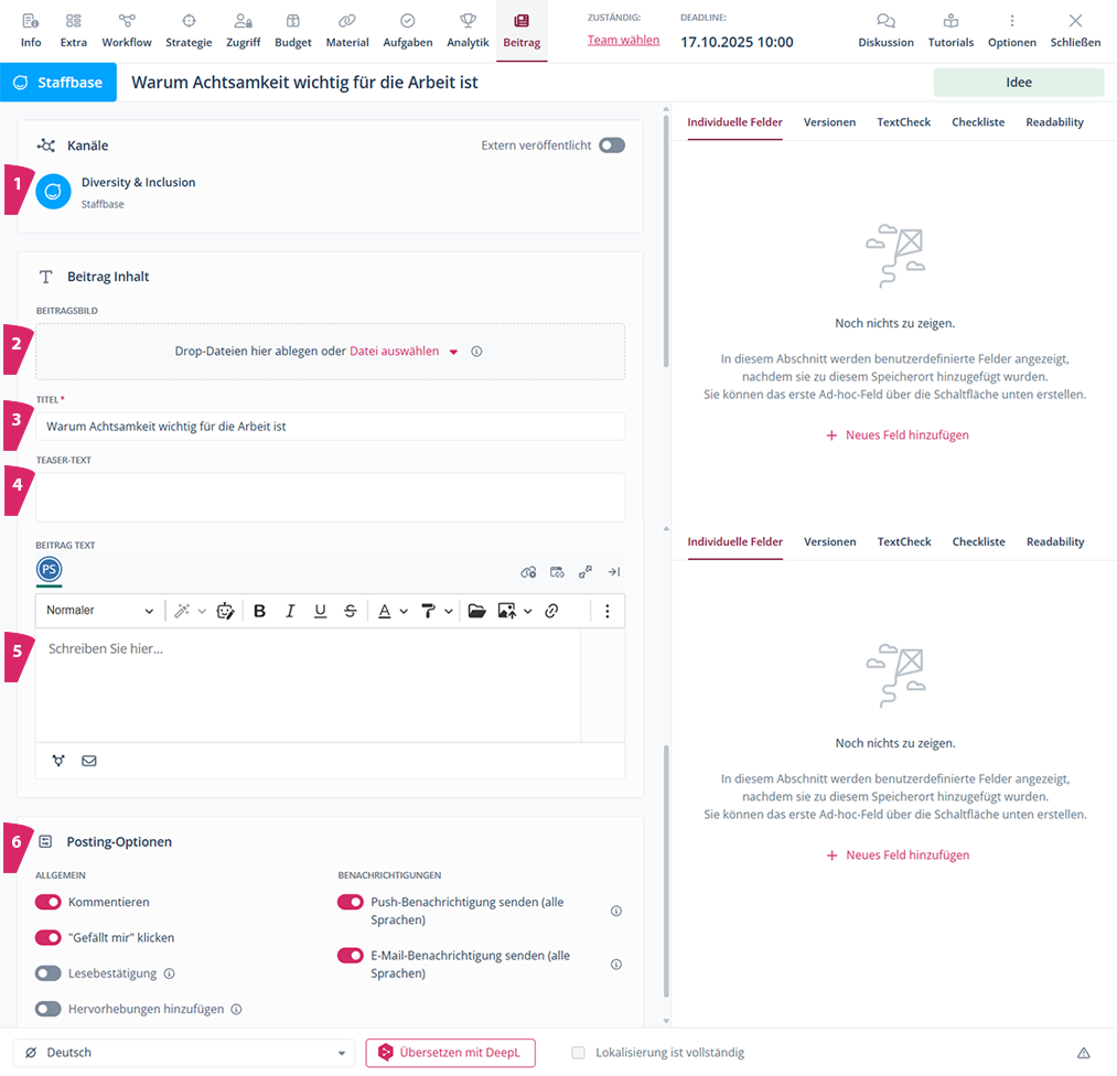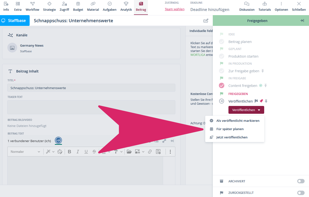 7. Lassen Sie den Beitrag freigeben und legen Sie das Veröffentlichungsdatum fest. Der Beitrag kann als veröffentlicht markiert, für später geplant oder direkt veröffentlicht werden und wird im ausgewählten Kanal angezeigt: