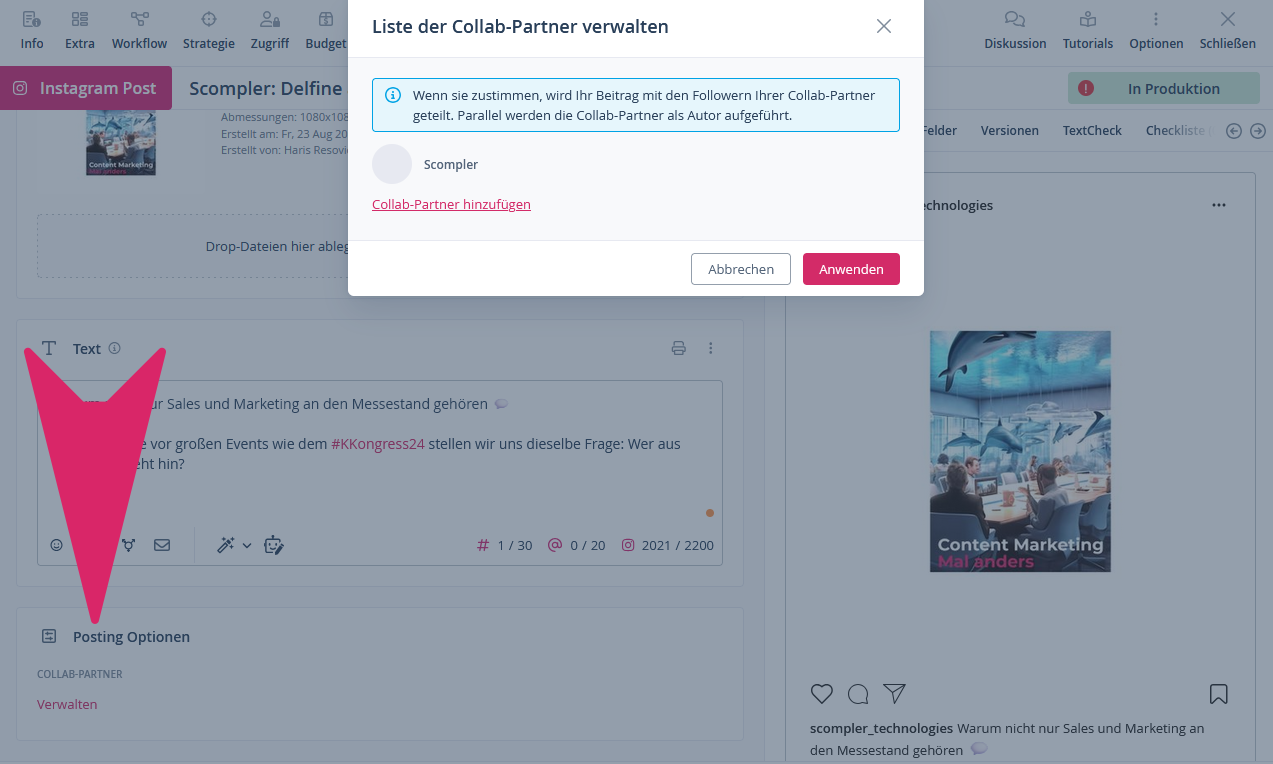 Erstellen Sie Instagram-Posts über Scompler und binden Sie Collab-Partner ein, um Ihre Reichweite zu steigern und Kollaborationen sichtbar zu machen.