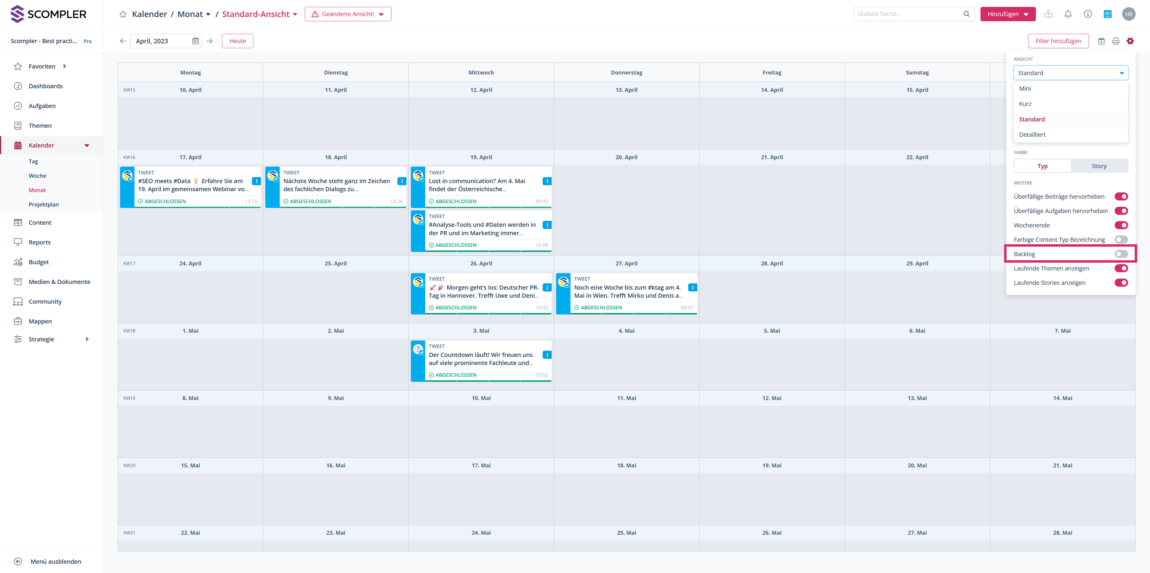 Hinweis: Im Backlog finden Sie alle Beiträge, bei denen noch keine Deadline hinterlegt ist. Diese können Sie von hier einfach auf das gewünschte Veröffentlichungsdatum ziehen.