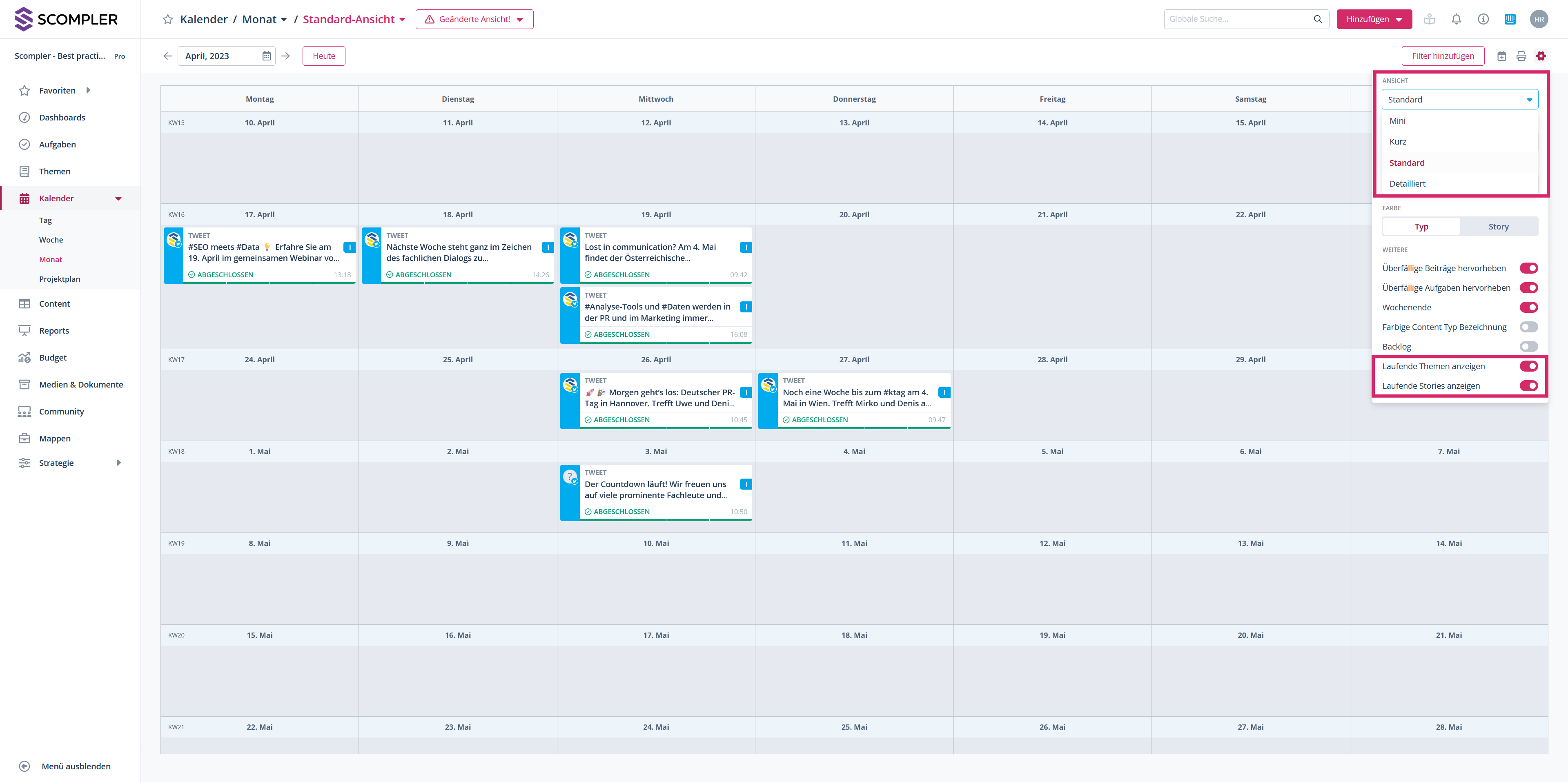 Wechseln Sie zwischen der Tages-, Wochen-, Monats-, Quartals- und Jahresansicht, legen Sie fest, ob Ihre Beiträge in der Farbe des Beitragstypen oder der zugehörigen Story angezeigt werden, und wie detailliert Ihre Inhalte dargestellt werden.