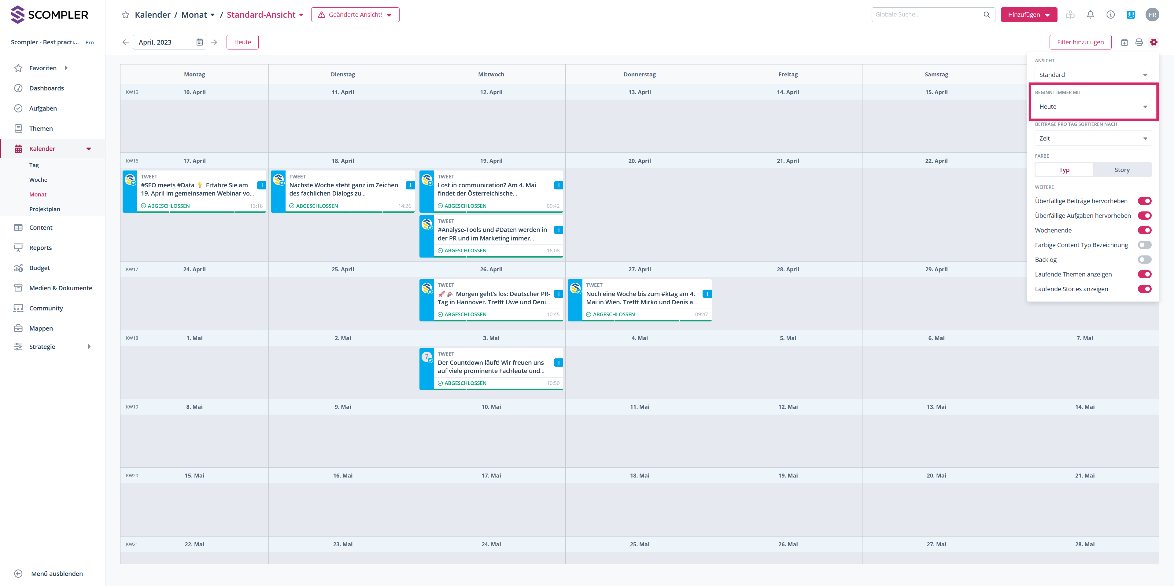 Entscheiden Sie, welchen Farben die Beiträge entsprechen sollen – die Farbe des Content-Typen oder der Story, wie die Beiträge sortiert werden sollen – nach Content-Typen oder Zeit – und wo die Kalenderansicht anfangen soll: bei „Heute“ oder da, wo Sie das letzte Mal den Kalender verlassen haben.