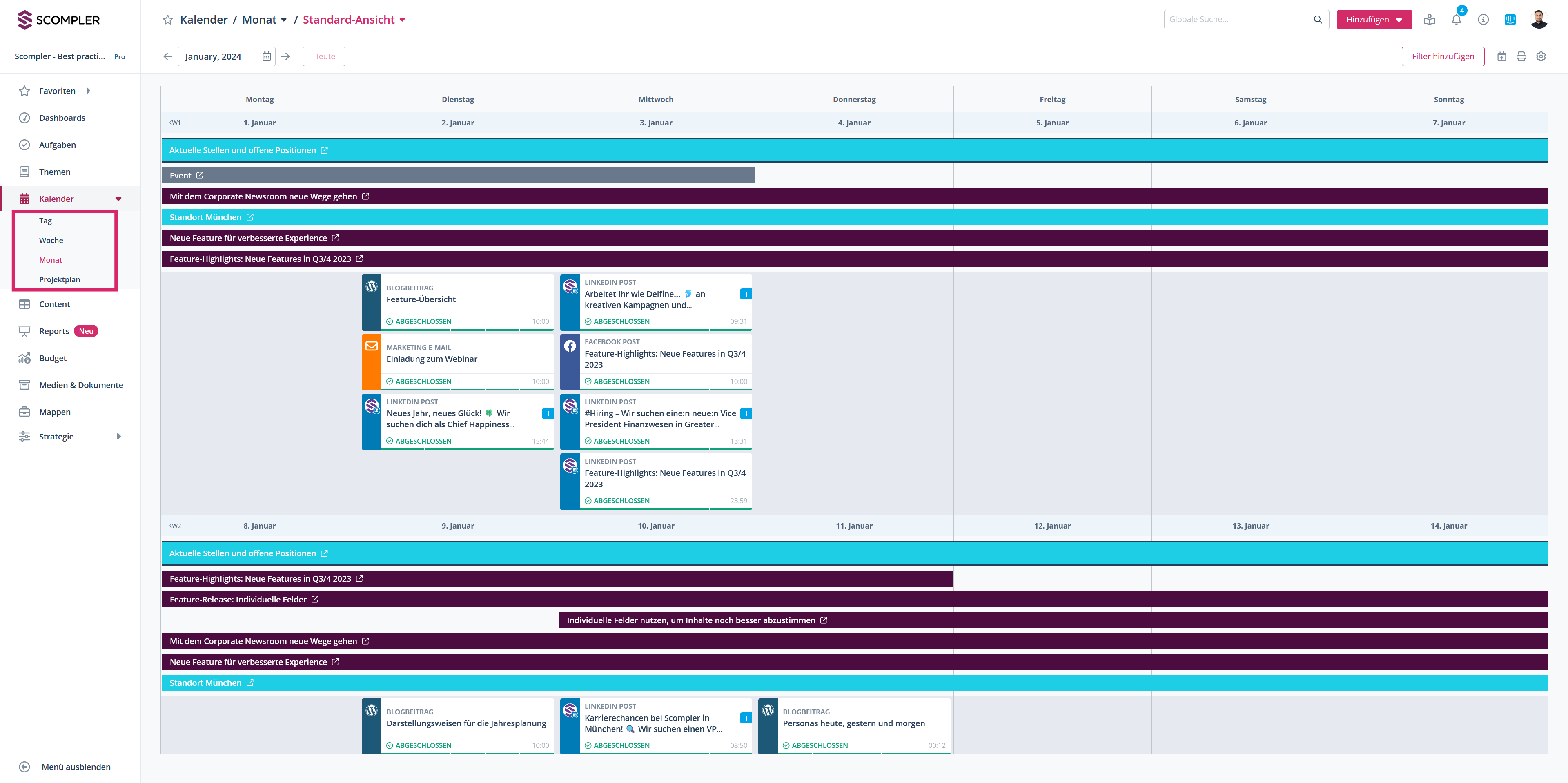 Oberhalb des eigentlichen Kalender-Bereichs können Sie Filter aktivieren. Sie können beispielsweise bestimmte Elemente ausblenden, nur Beiträge in einem bestimmten Bearbeitungsstatus anzeigen, ein bestimmtes Themenfeld oder bestimmte Beitragsarten auswählen.