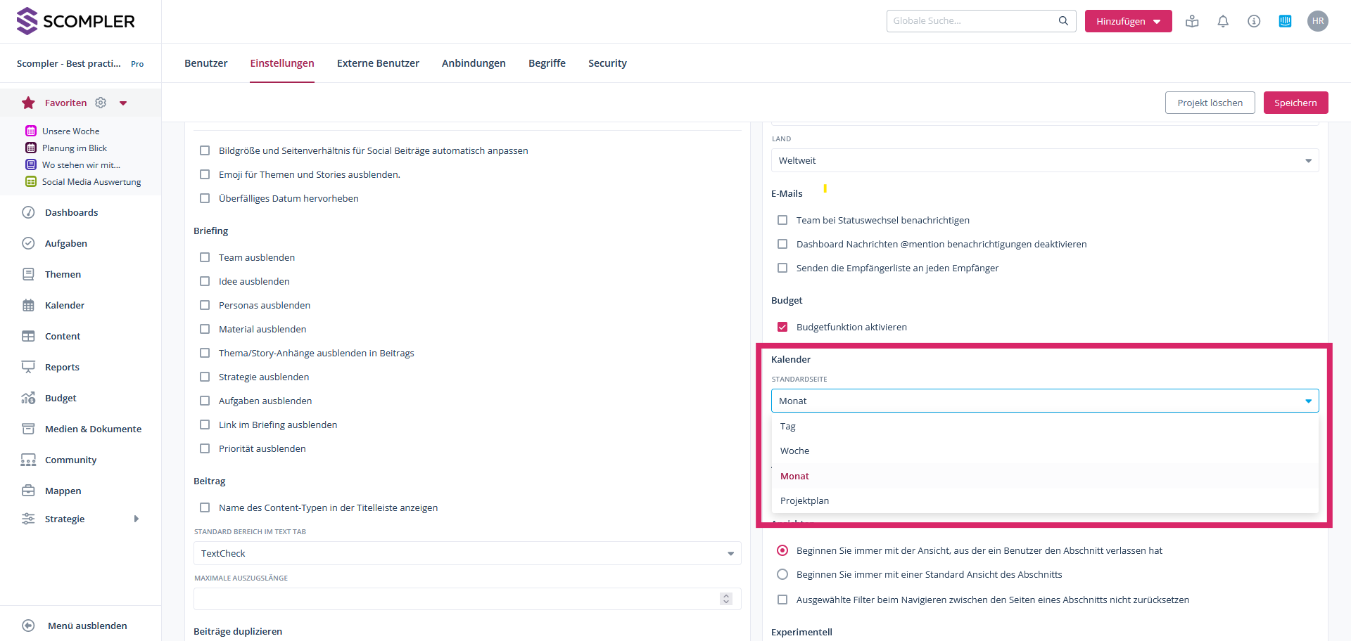 Um einzustellen, welcher Kalendertyp als Standard angezeigt wird, müssen Sie in die Projekteinstellungen im Bereich „Kalender“ im Drop-Down-Menü den Standardkalender auswählen.