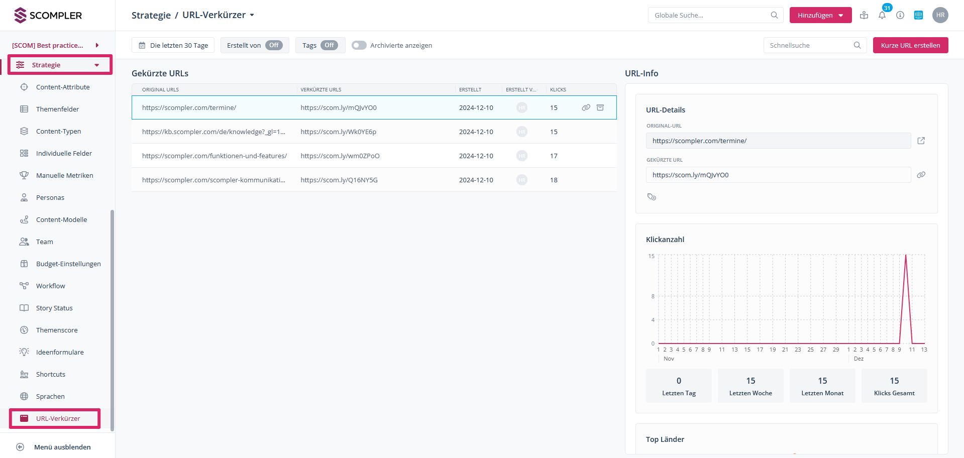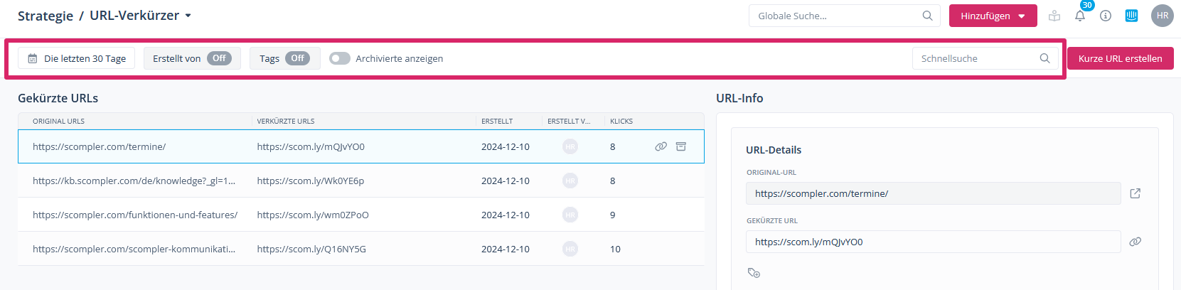 Wenn Sie die entsprechenden Berechtigungen haben, können Sie sich über den Menüpunkt „URL-Verkürzer“ im Bereich Strategie in der linken Navigationsleiste jederzeit die Performance Ihres Links anschauen. Bestehende Links können Sie nachträglich bearbeiten, indem Sie auf das Bleistift-Symbol neben dem entsprechenden Link klicken. Ebenso können Links archiviert werden, mit Klick auf das Kartonsymbol.