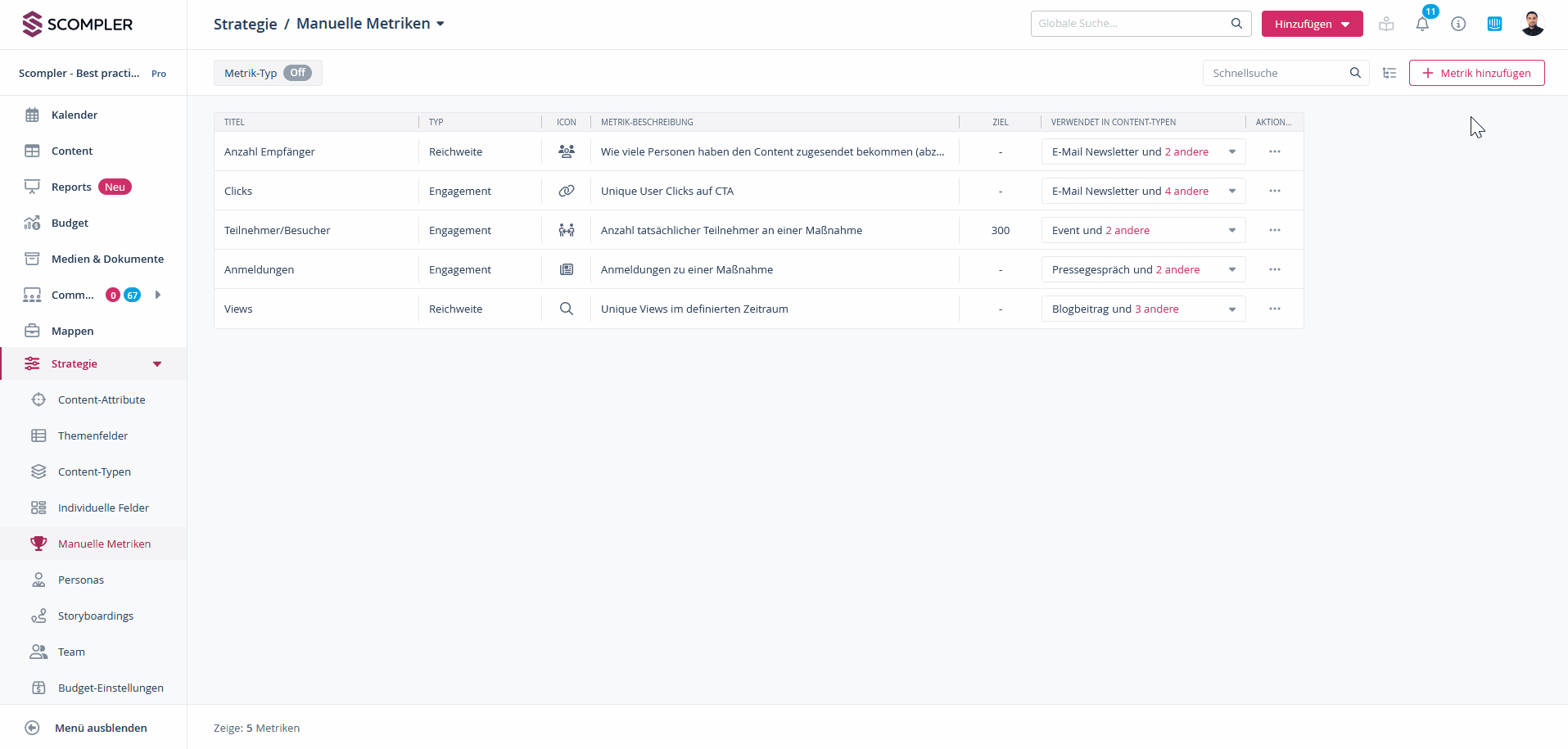 Möchten Sie eigene Metrik-Typen hinzufügen, dann gehen Sie auf das Symbol rechts neben der Schaltfläche „Metrik hinzufügen“. Hier können Sie neue Typen hinzufügen, bestehende umbenennen und löschen. Die drei Standard-Metrik-Typen „Reichweite“, „Engagement“ und „Impressionen“ können nicht entfernt oder bearbeitet werden.