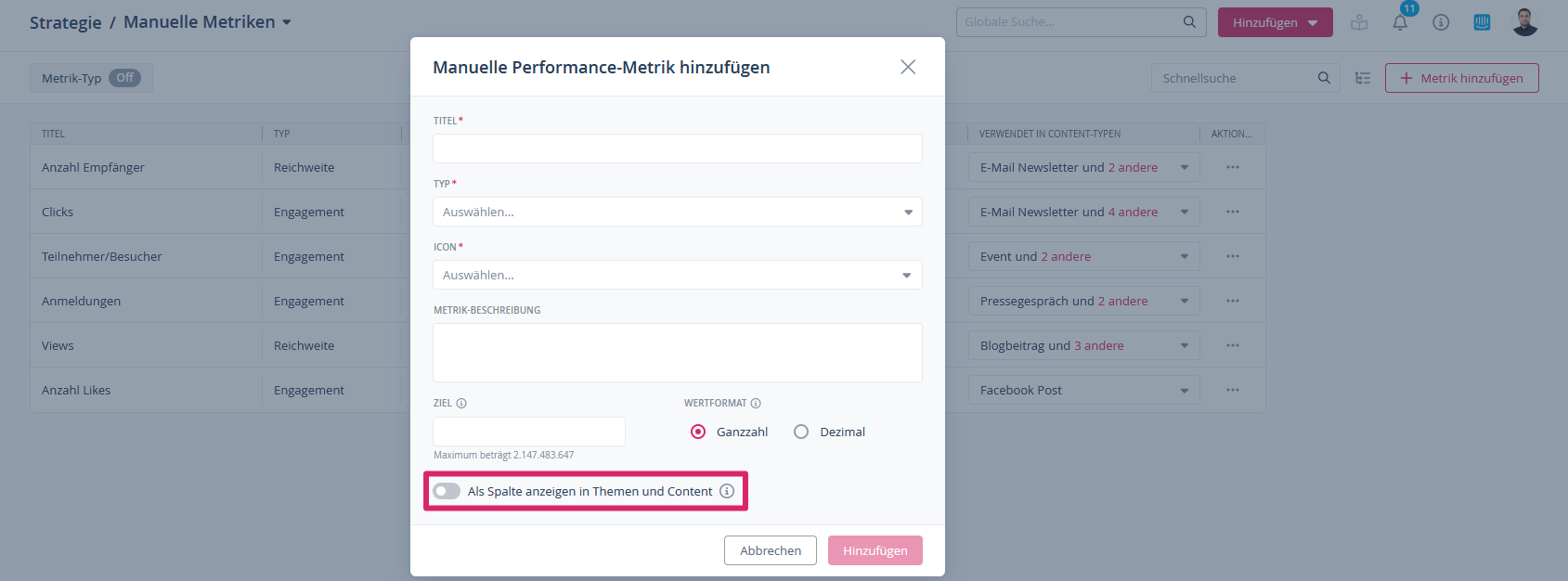 Die manuellen Performance-Daten sind ebenfalls als Spalten im Content-Bereich verfügbar. Damit Ihre Metrik angezeigt wird, müssen Sie im Bereich „Strategie“ > „Manuelle Metriken“ beim Erstellen oder Bearbeiten folgende Option aktivieren: