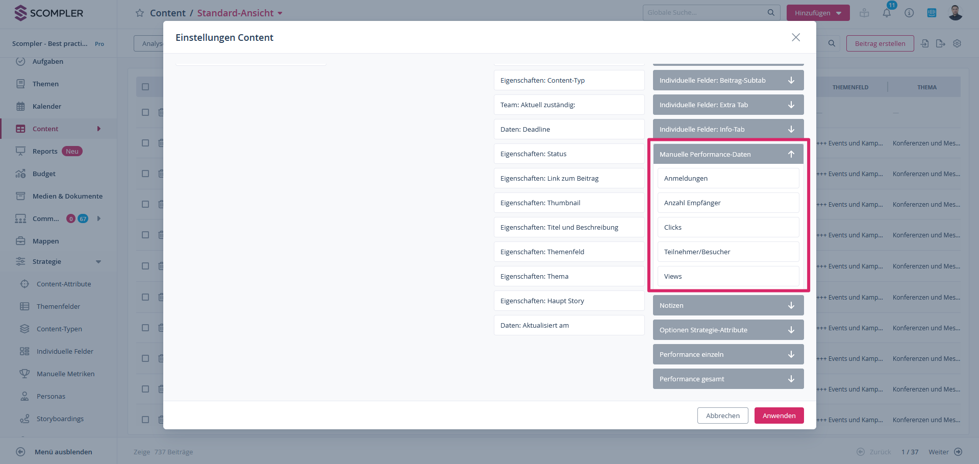 Gehen Sie im Content-Bereich anschließend in die erweiterten Einstellungen (über Zahnrad-Symbol rechts oben) und wählen Sie in der Kategorie „Manuelle Performance-Daten“ Ihre gewünschten Metriken aus. Fügen Sie Ihre Änderungen der Ansicht hinzu oder erstellen Sie eine komplett neue Ansicht. Wie das funktioniert, erfahren Sie in diesem Artikel.