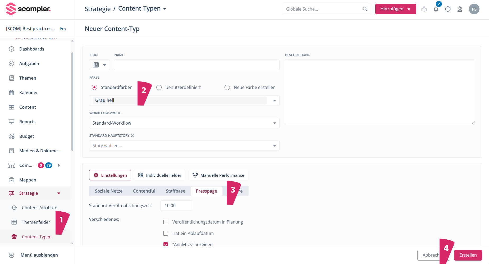 - Klicken Sie im linken Navigationsmenü auf „Strategie“, dann „Content-Typen“ und danach „Neuer Content-Typ" oben rechts.