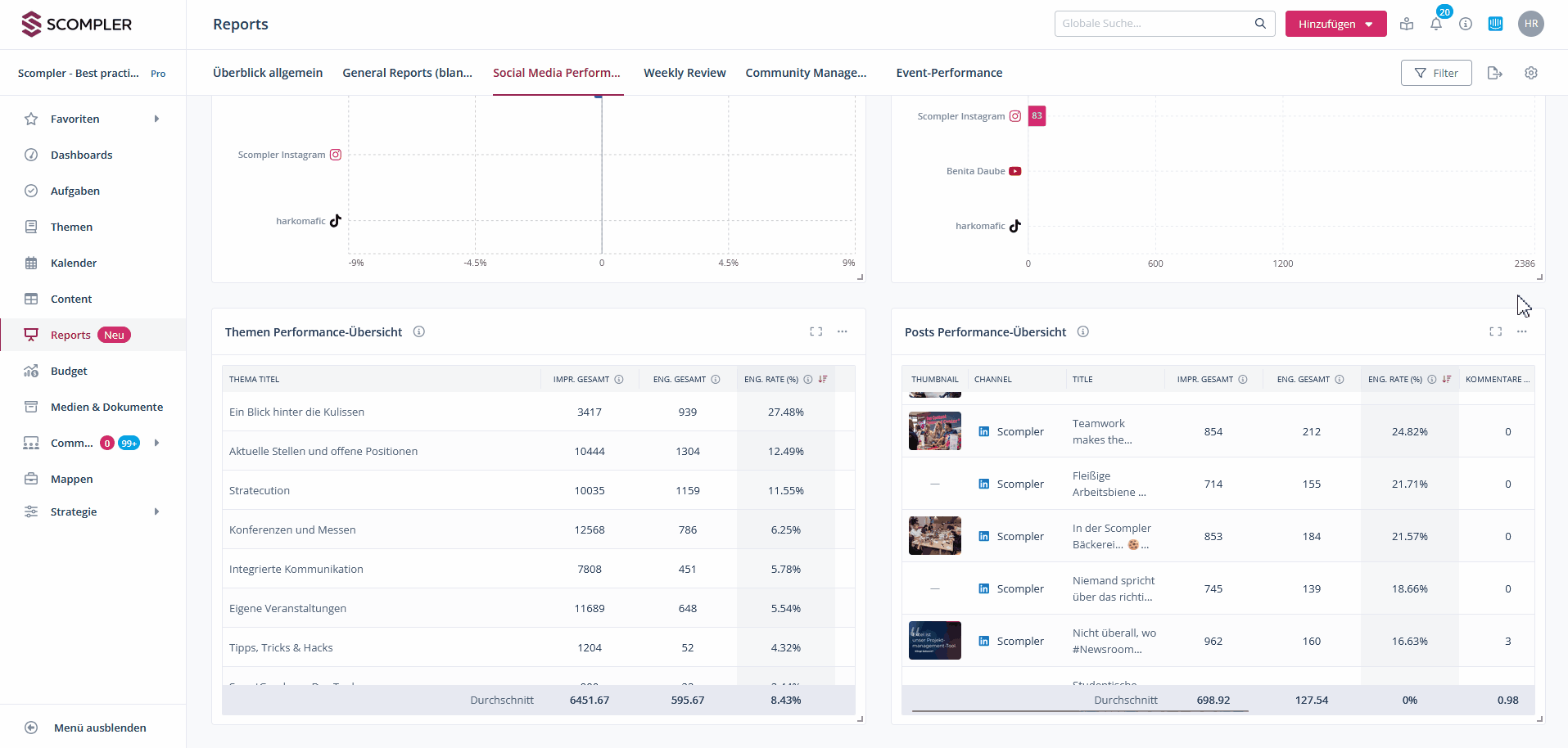 Neben allgemeinen Widgets bietet Ihnen Scompler im Reports-Bereich spezifische Social Media-Widgets. Mit diesen haben Sie stets im Blick, wie Ihre Social Media-Kanäle und Maßnahmen performen.