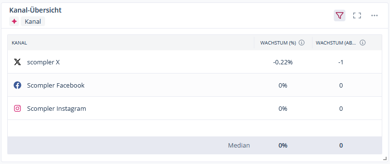 Das Widget „Kanal-Übersicht“ bietet eine Übersicht aller Kanäle samt ihrem Wachstum. Hier haben Sie die Möglichkeit, nach Kanälen und Zeiträumen zu filtern. Das Wachstum wird in einem Prozentwert und einem absoluten Wert des jeweils ausgewählten Zeitraums angegeben.