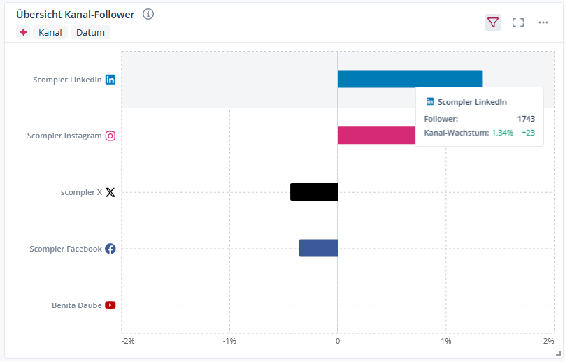 Das Widget „Übersicht Kanal-Follower“ zeigt Ihnen in Form eines Balkendiagramms die Follower-Veränderung des jeweiligen Kanals innerhalb des ausgewählten Zeitraums. Mit dem Mauszeiger können Sie über die einzelnen Balken gehen, um die aktuelle Follower-Anzahl und die Wachstumsrate im gewählten Zeitraum zu sehen. Auch hier steht Ihnen der Kanal-Filter zur Verfügung.