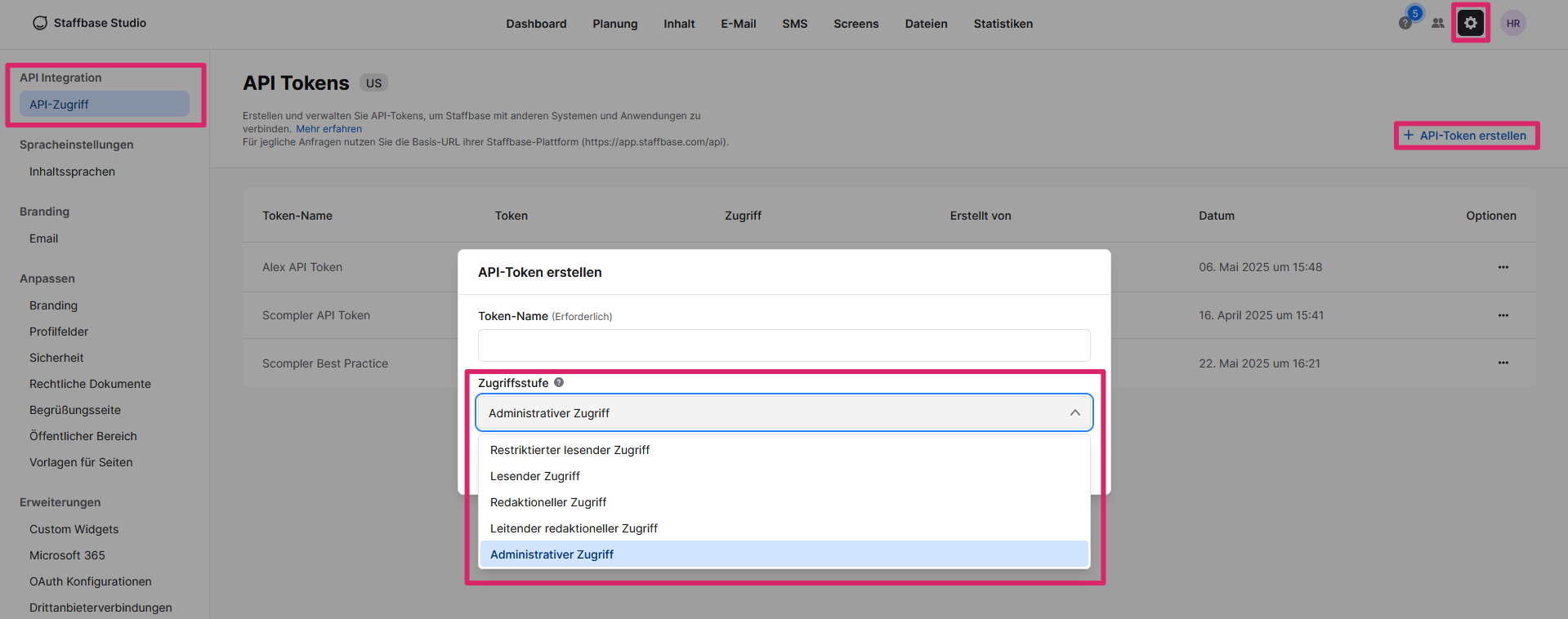 Um einen Token in Staffbase zu erstellen, benötigen Sie Administratorrechte auch für diese Plattform: