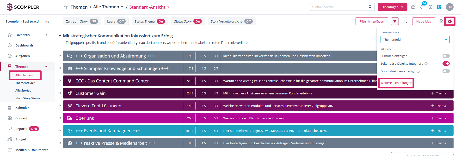 Die Ansichten in Scompler können individuell angepasst werden, sodass Sie die wichtigsten Informationen auf einen Blick sehen können. Verwenden Sie die Einstellungen für Themen und Stories und legen Sie fest, welche Informationen in der Themenansicht angezeigt werden. Um diese zu öffnen, klicken Sie auf das Konfigurationsrad und wählen Sie die Option „Weitere Einstellungen“.