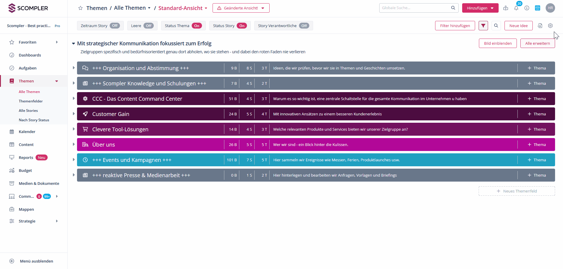 Richten Sie die Themenansicht ein, um einen Überblick über die Themen und Stories zu erhalten, die mit dem integrierten ThemenScore bewertet wurden.