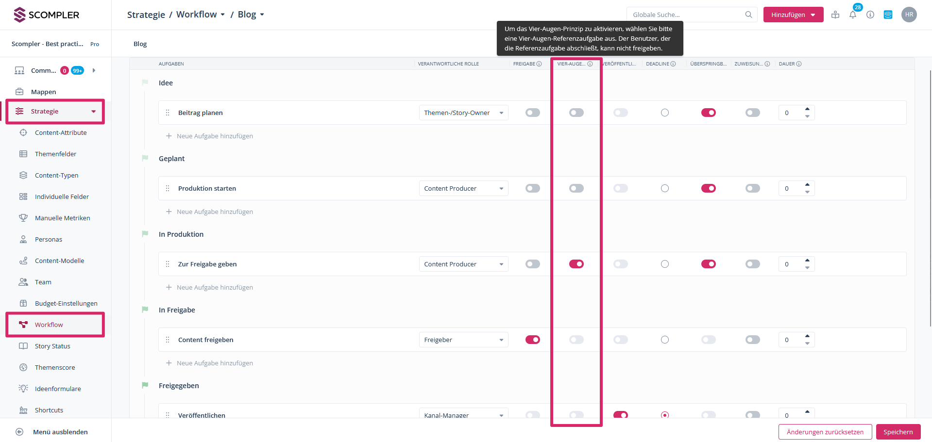 Navigieren Sie hierfür in den Workflow-Bereich unter Strategie. Hier erstellen Sie einen neuen Workflow oder bearbeiten einen bestehenden. Entscheiden Sie zunächst, welche Aufgabe die Freigabe ist, und aktivieren Sie diese mit der Schaltfläche in der Spalte „Freigabe“. Sie erkennen, dass die Freigabe aktiviert ist, wenn die Schaltfläche von grau auf pink wechselt. Wählen Sie dann die Vier-Augen-Referenzaufgabe und aktivieren Sie diese ebenfalls mit der Schaltfläche in der Spalte „Vier-Augen“ – beachten Sie, dass die Referenzaufgabe vor der Freigabe erfolgen muss.