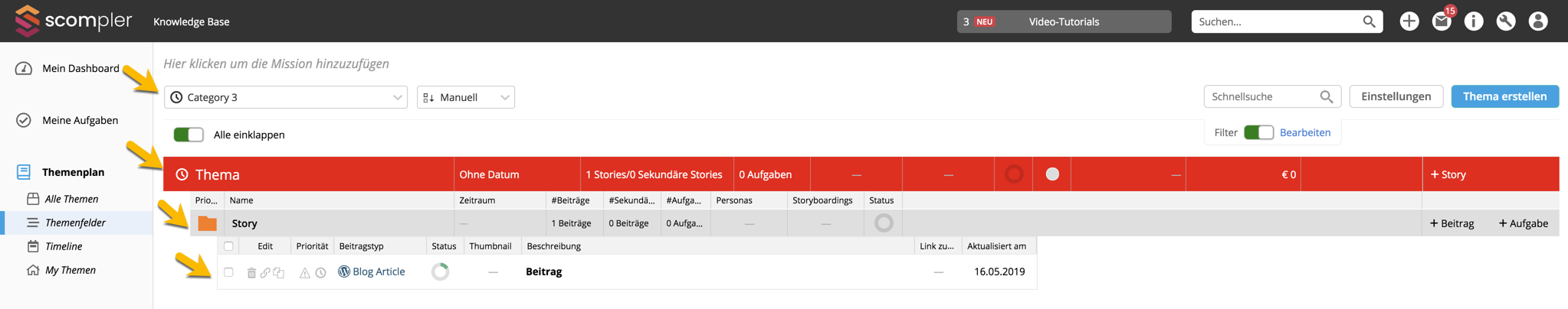 Der Themenplan in Scompler ermöglicht es Ihnen aus einer themenzentrierten Perspektive Ihre Content-Planung zu betrachten. Hier können (müssen Sie „technisch“ gesehen nicht!) Sie jeden Content in Themen und Stories einordnen.