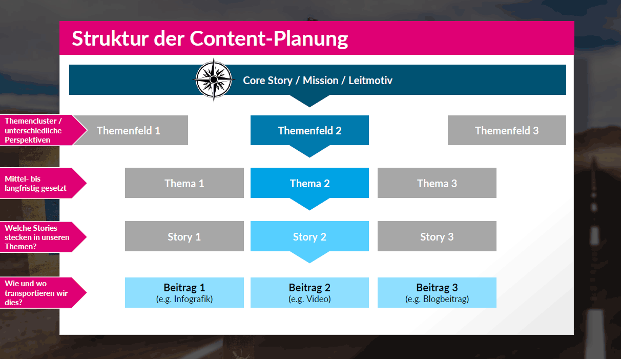 Im Themenplan können Sie ebenfalls Ihre Content Strategie auf Themen- und / oder Story-Ebene einstellen, um „vom Groben zum Feinen“ zu kommen.