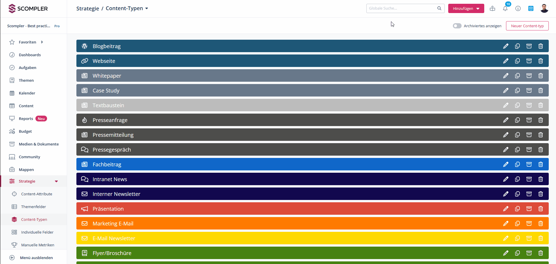 Im linken Navigationsmenü finden Sie unter „Strategie" einen Menüpunkt „Content-Typen". Hier finden Sie bereits eine Auswahl der gängigsten Beitragstypen: