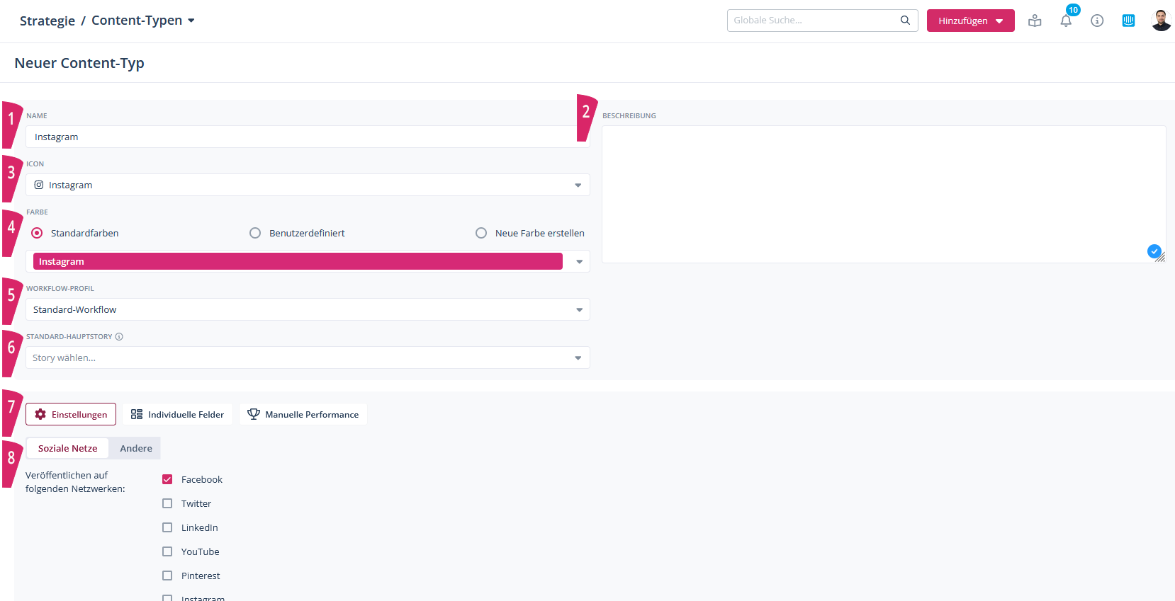 - Nur für PRO-Lizenz verfügbar - Entscheiden Sie, welcher Workflow am besten zu Ihrem Content-Typ passt. Die Aktivierung der Checkbox „Content Master“ stellt sicher, dass dieser Content-Typ immer an oberster Stelle in der Liste Ihrer späteren Beiträge zu einer Story angezeigt wird.