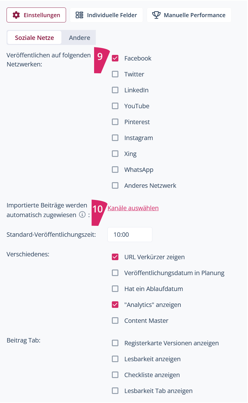 Der Tab „Manuelle Performance” erlaubt es Ihnen, Metriken mit Beiträgen von diesem Content-Typen zu verknüpfen. Diese erscheinen dann im „Analytik”-Tab der Beitragskarte. Erfahren Sie hier mehr.
