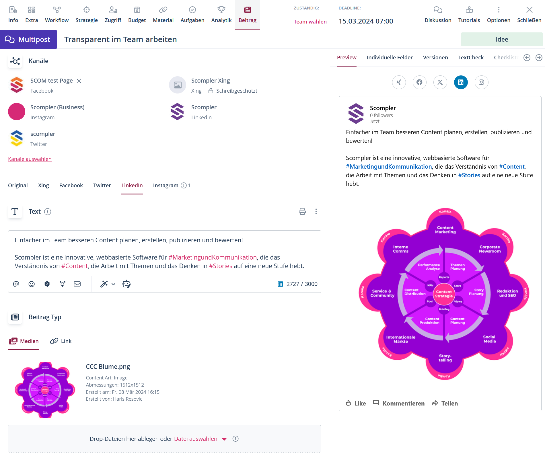 Wenn Sie Ihren Content-Typen zur Veröffentlichung auf einem Social-Media-Kanal definiert haben, wird der Beitrags-Bereich auf ihrer Beitragskarte entsprechend optimiert dargestellt. Ihnen stehen nur eingeschränkte Textbearbeitungsfunktionen zur Verfügung, dafür können Sie sich direkt eine Vorschau für den gewählten Kanal anzeigen zu lassen, um die optische Wirkung Ihres Beitrags vor der Veröffentlichung zu überprüfen.
