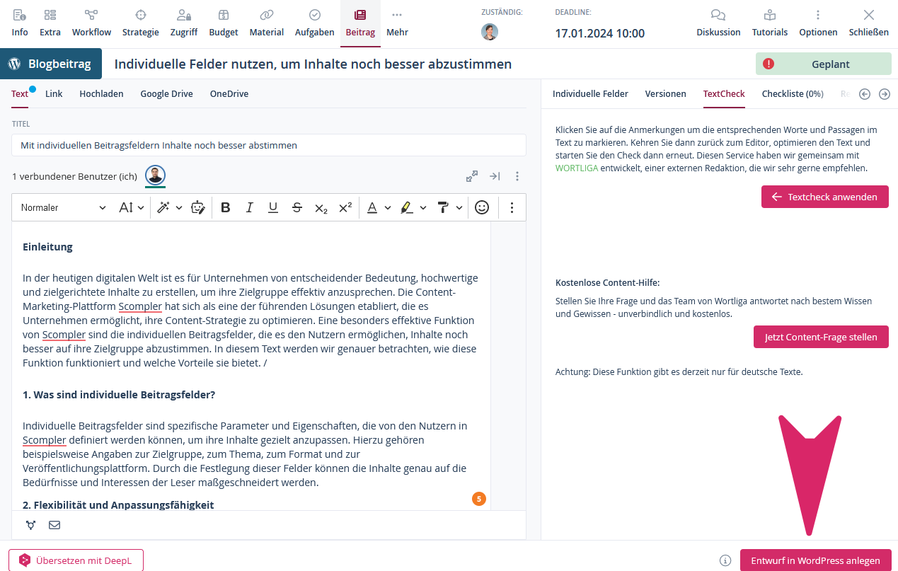 Wenn Sie keinen Social-Media-Content-Typ erstellen möchten, wählen Sie die Registerkarte „Andere“ und entscheiden Sie, welche Optionen in der Beitragskarte dieses Content-Typs angezeigt werden sollen. In dieser Beitragskarte stehen Ihnen erweiterte Optionen der Textbearbeitung zur Verfügung. Bei der Auswahl als Webseiten- oder Blog-Beitrag und der entsprechenden Anbindung an Ihr Content Management System (CMS), können Sie Ihren Textentwurf und ausgewählte Bilder direkt als Entwurf in Ihr CMS, hier im Beispiel Wordpress, exportieren: