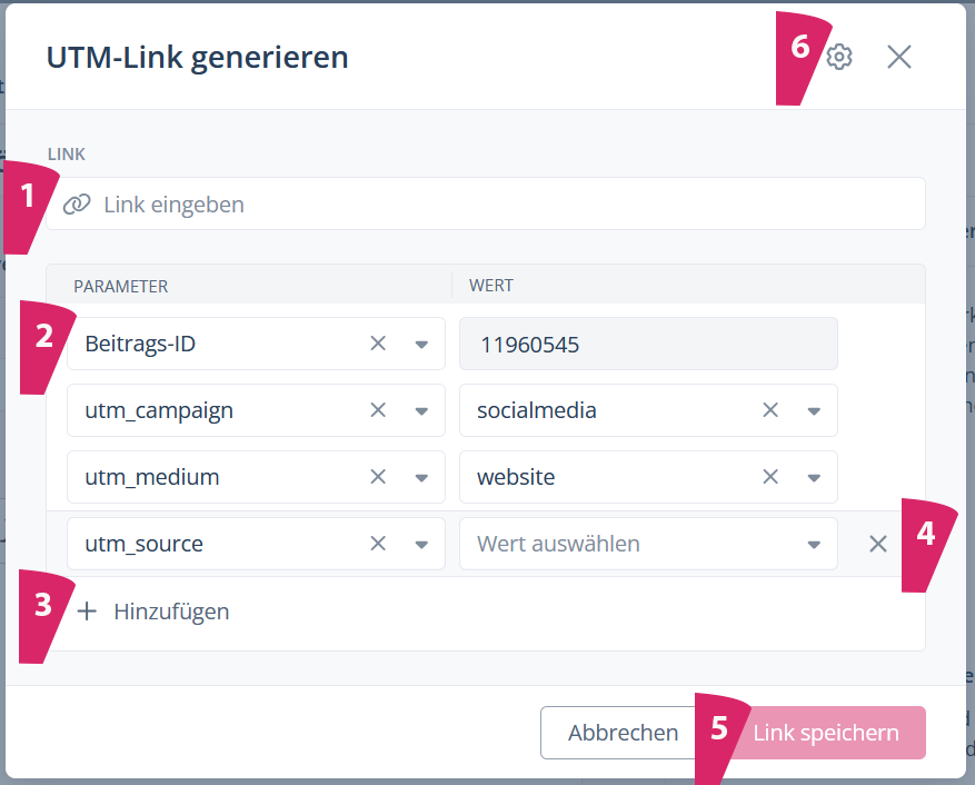 HINWEIS: Die URL muss mit „http(s)://“ beginnen. Jeder erstellte UTM-Link ist nur für den jeweiligen Beitrag einsehbar. Werte und Parameter sind in allen Beiträge einsehbar.
