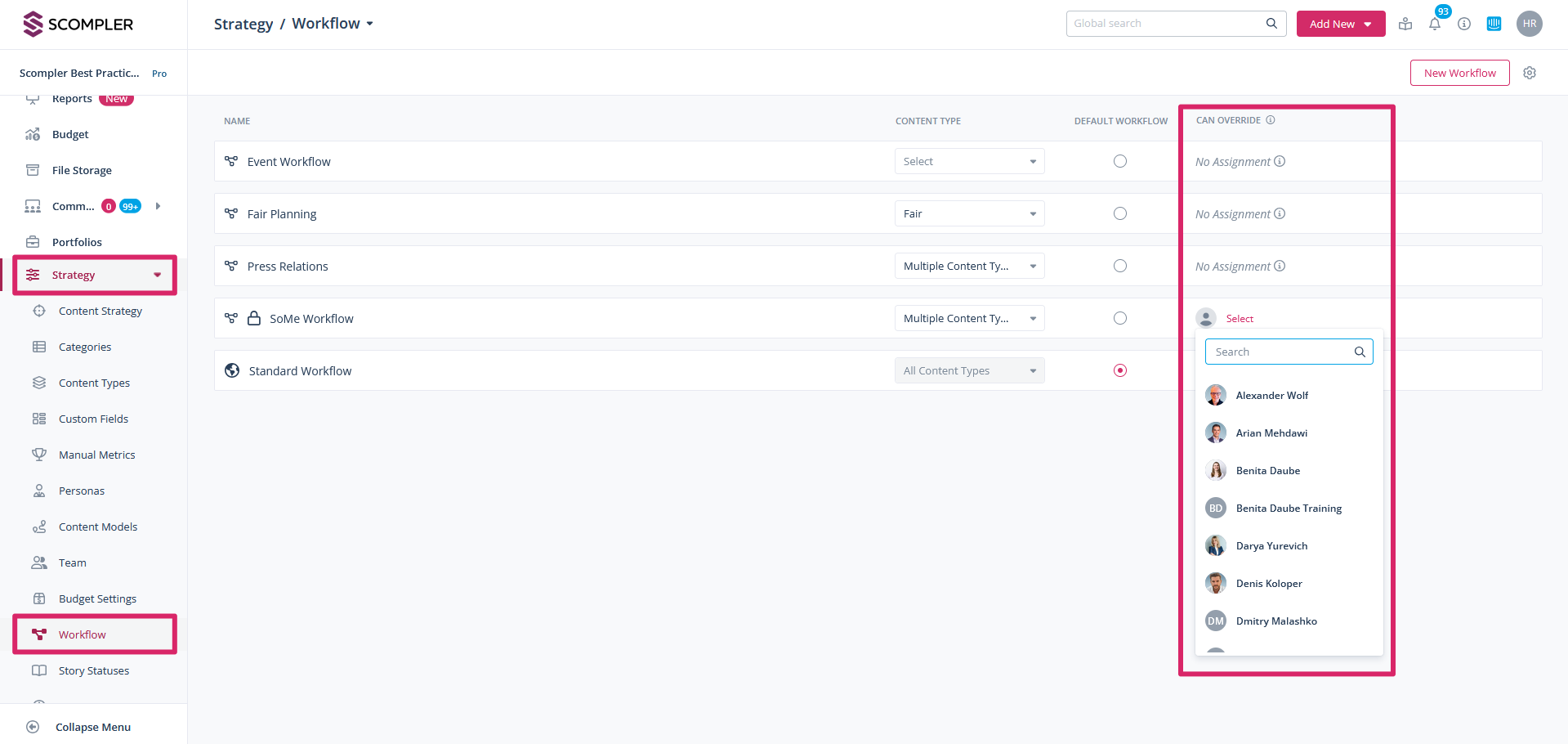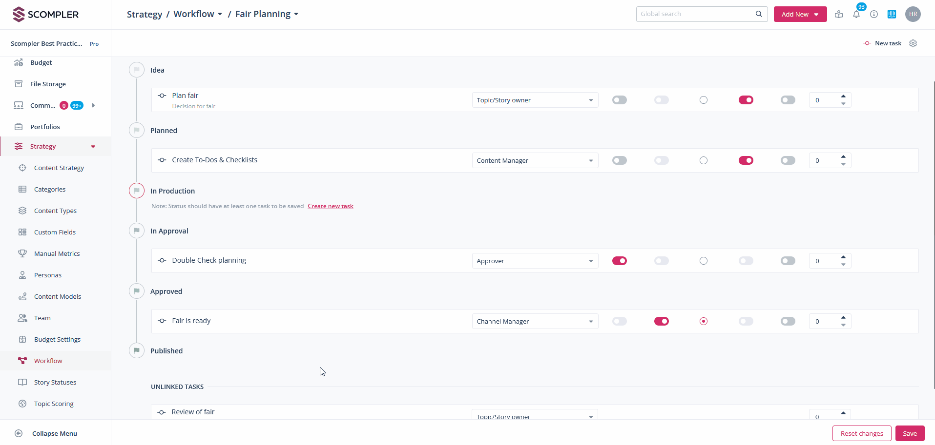 To customise the workflows, open the workflow section in the strategy menu. Click on the workflow's name to edit. Define which tasks can be skipped when creating articles, which tasks correspond to the approval, and which tasks are to be used for display in the calendar. The approval step must always take place BEFORE publishing.