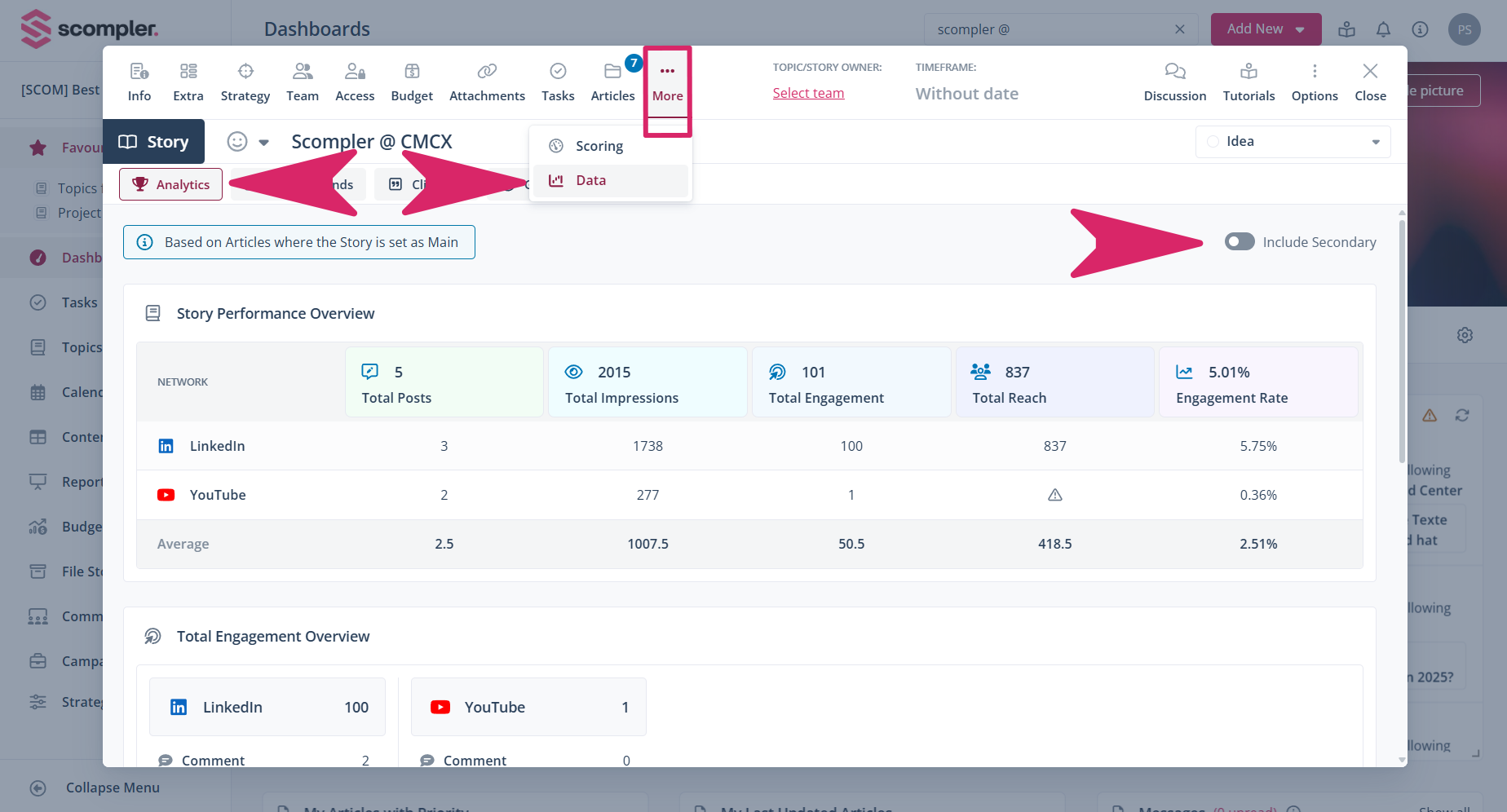 Scompler shows you the KPIs of the articles published in each topic and/or story: