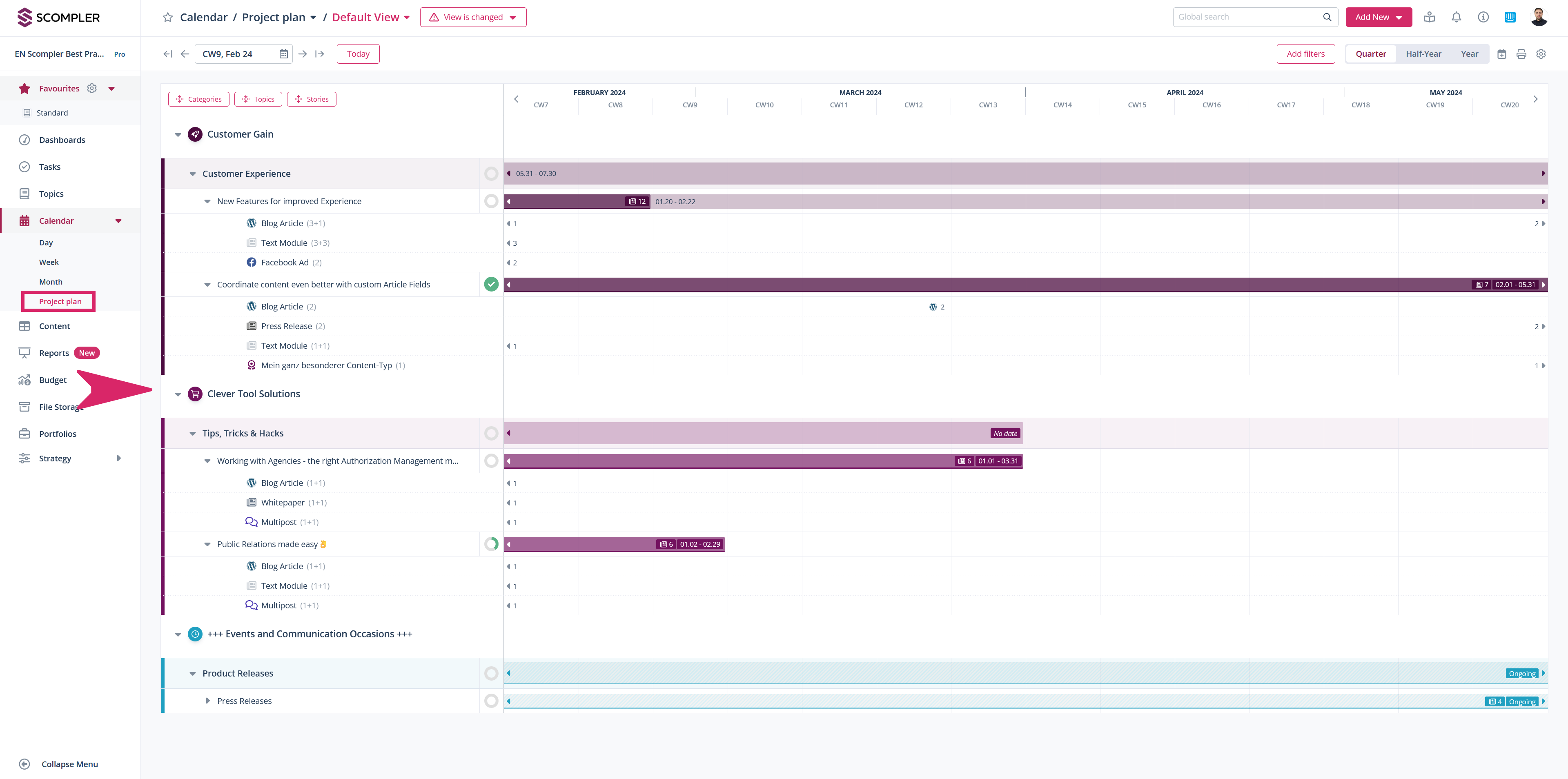 This view gives you a perfect overview of the chronological progress of your communication planning in each quarter, half a year or the whole year. This in turn allows you to visualize the activity schedule, work breakdown structure, resource plan, etc.