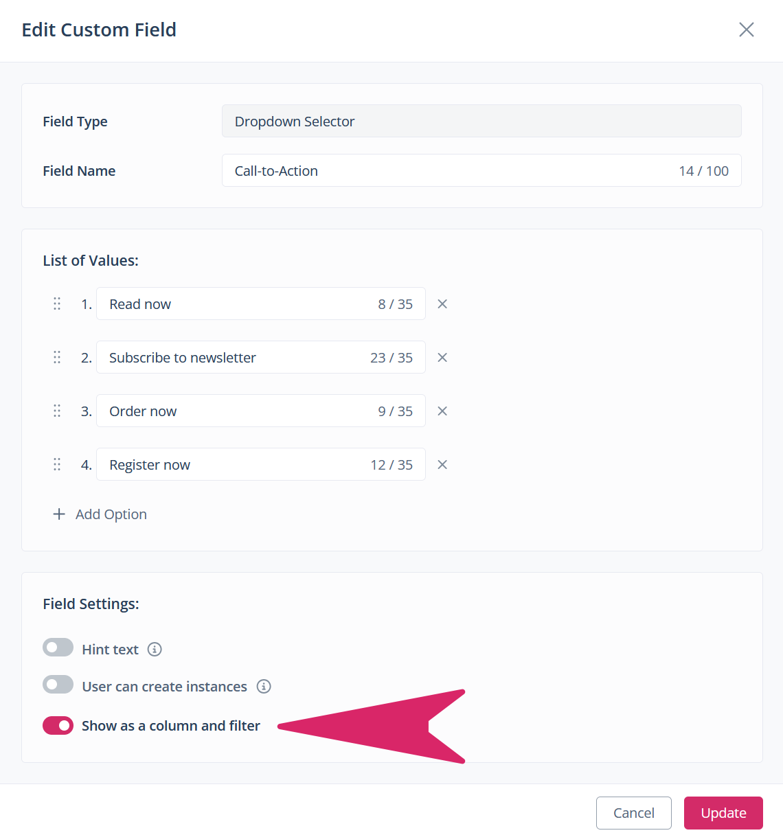 The contents of custom fields are also available as filters and can be displayed as columns in views in the Topic and Content sections. To make your custom fields available in the filters, the option “Show as a column and filter” must be enabled for the respective field: