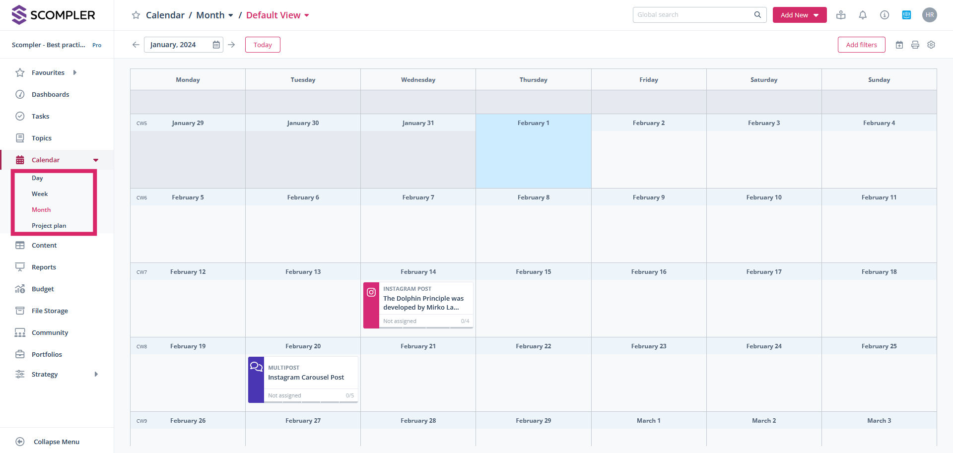 In a larger project, the calendar can quickly become very full. To keep an overview at all times and easily access the relevant content, we recommend working with different saved views.