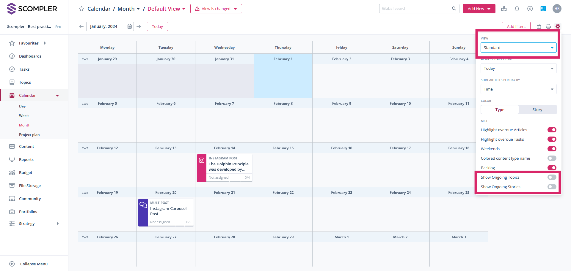 Switch between the daily, weekly, monthly, quarterly and annual view, determine whether your articles are displayed in the color of the article type or the associated story, and how detailed your content is displayed.