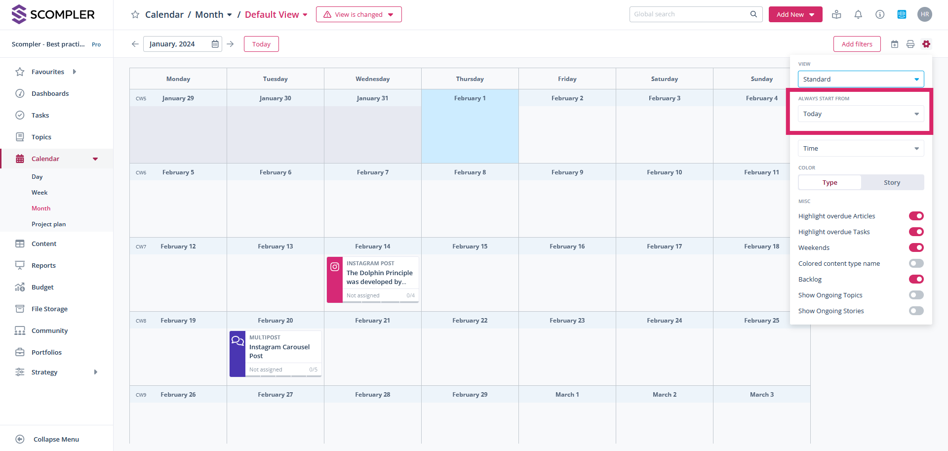 Decide which colors the articles should correspond to — the color of the content type or story, how the articles should be sorted — by content types or time — and where the calendar view should start: at “Today” or where you last left the calendar.
