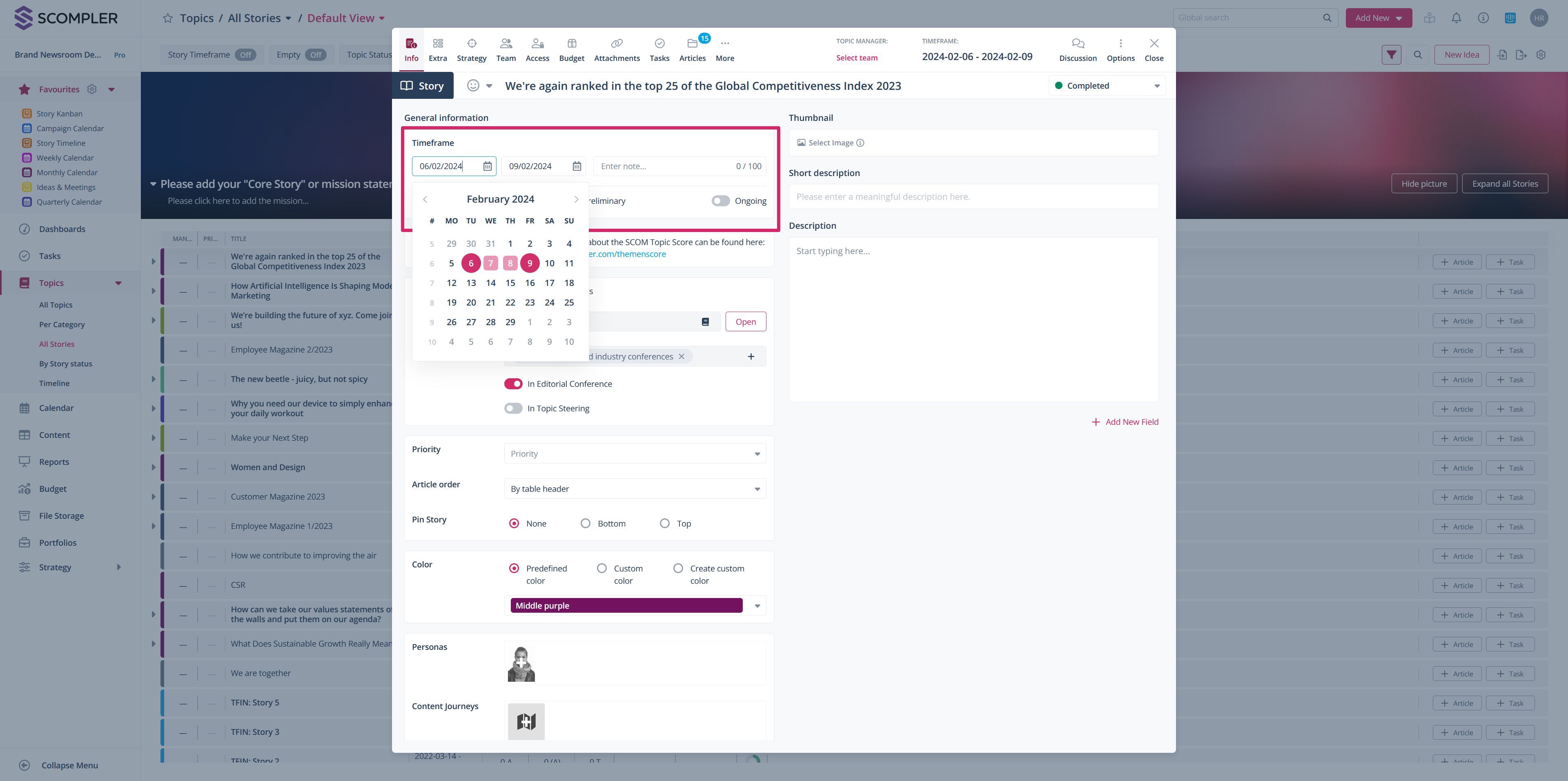 This option is very useful for stories that relate to ongoing topics and are continuously enriched with content (evergreens). If this option is activated, the date fields are grayed out. In the storyline, the story is displayed as "Ongoing story".
