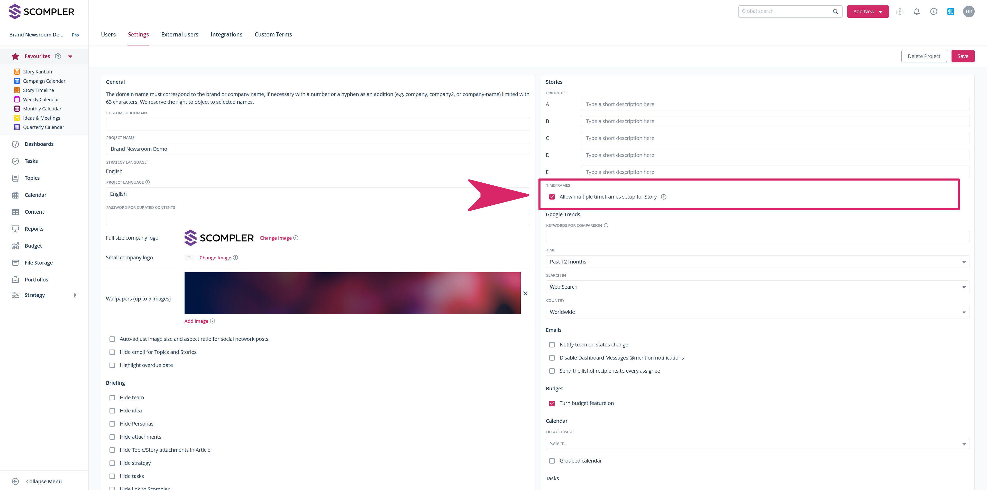 For campaigns that take place within a certain period of time or have a start and end date: In the "General" section, click the first box "Date From" to select the start date and then click "Date To" to select the end date of the story. Stories that have a specific time period are displayed in full color in the calendar.