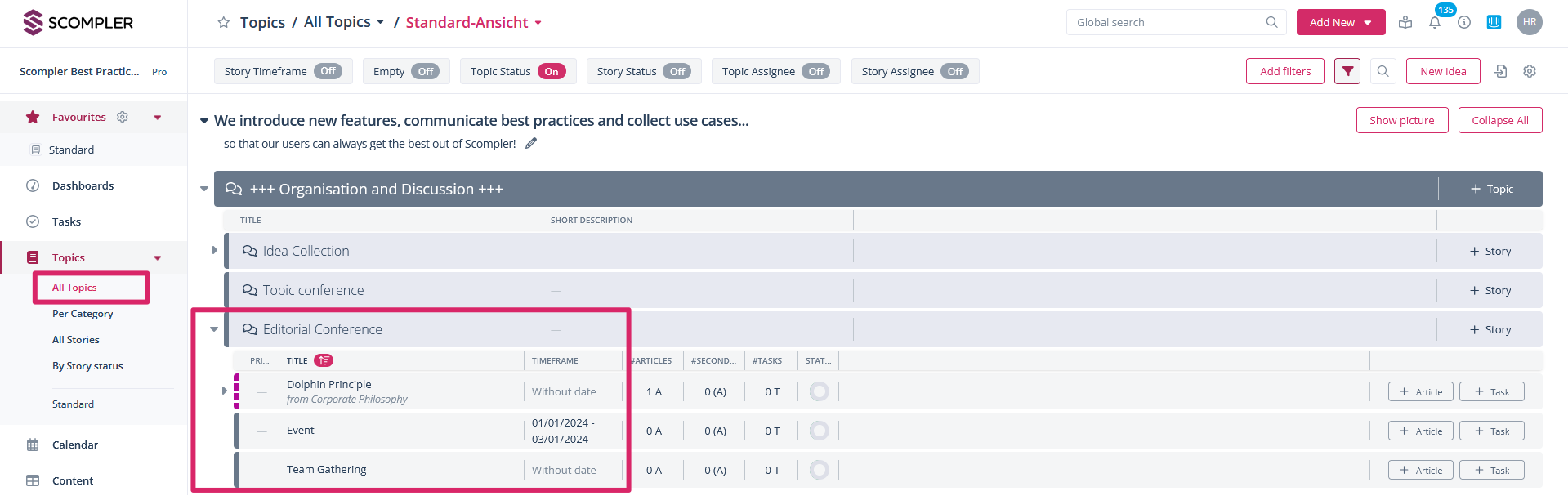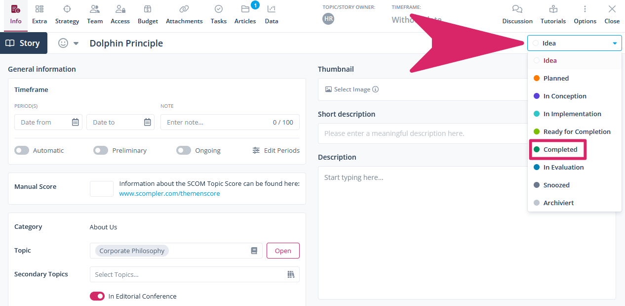 In the meeting you can then easily discuss and plan one story after the other. It's best to update the story status immediately, for example to “Completed” and remove the story from the “Editorial Conference” topic: