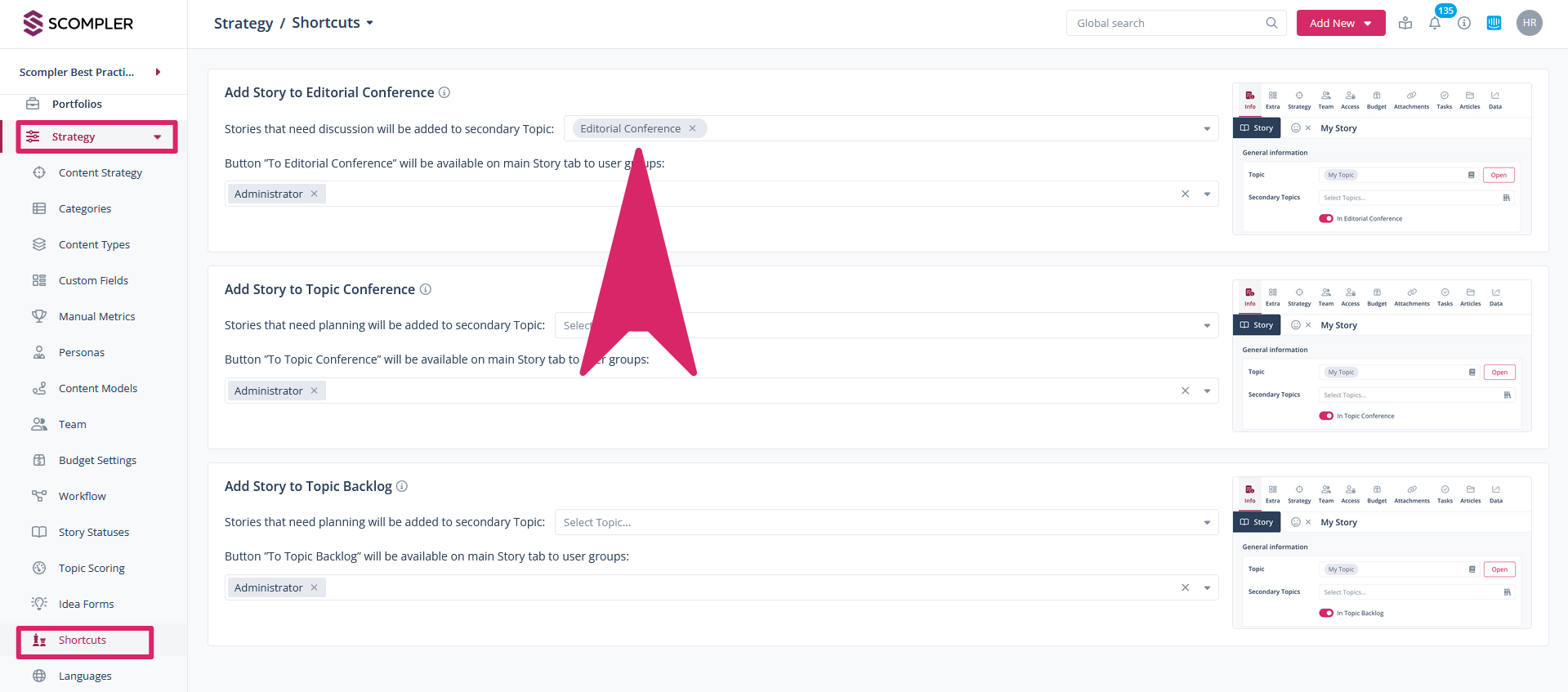 Tip for project administrators: In the menu item “Shortcuts” below “Strategy”, you can specify the target topic that is to be linked as an “Editorial Conference”.
