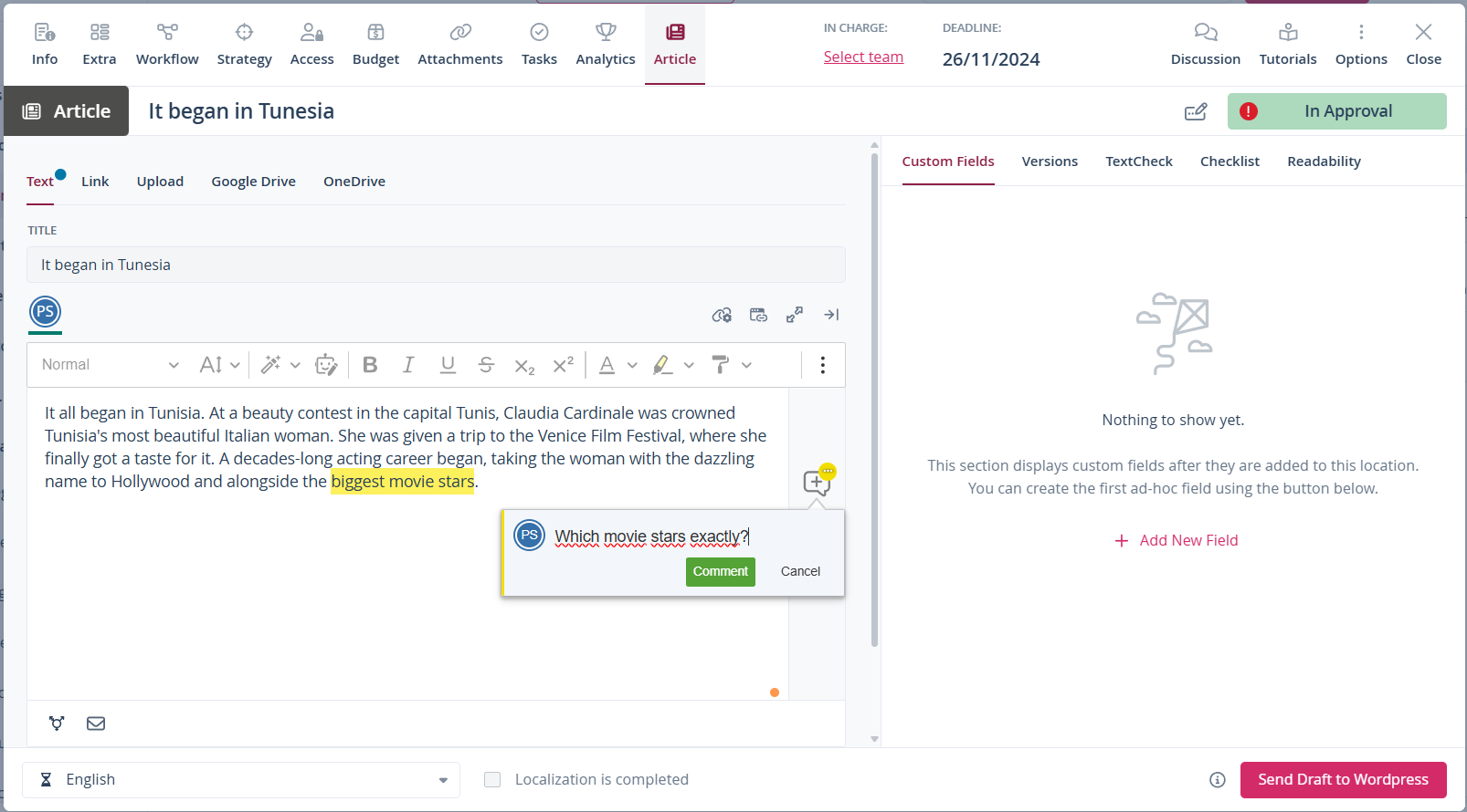 It is now possible to comment on articles directly in the text, even when they have “Pending approval” status. This allows everyone involved to comment on content in context – where feedback is most important – without making unwanted changes to the text.