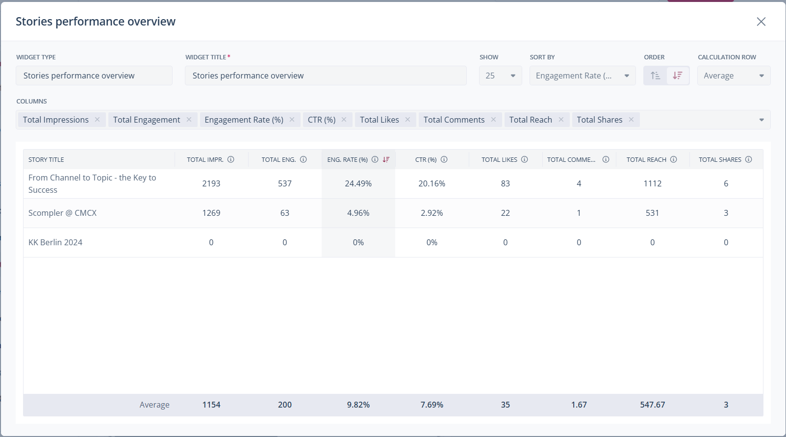 The performance widgets in the Reports section have undergone several improvements: we have added detailed engagement metrics such as likes, comments, shares, clicks, and CTR alongside the total values to the “Stories Performance Overview” and “Topics Performance Overview” widgets. In addition, LinkedIn reach and TikTok favorites are now also imported.