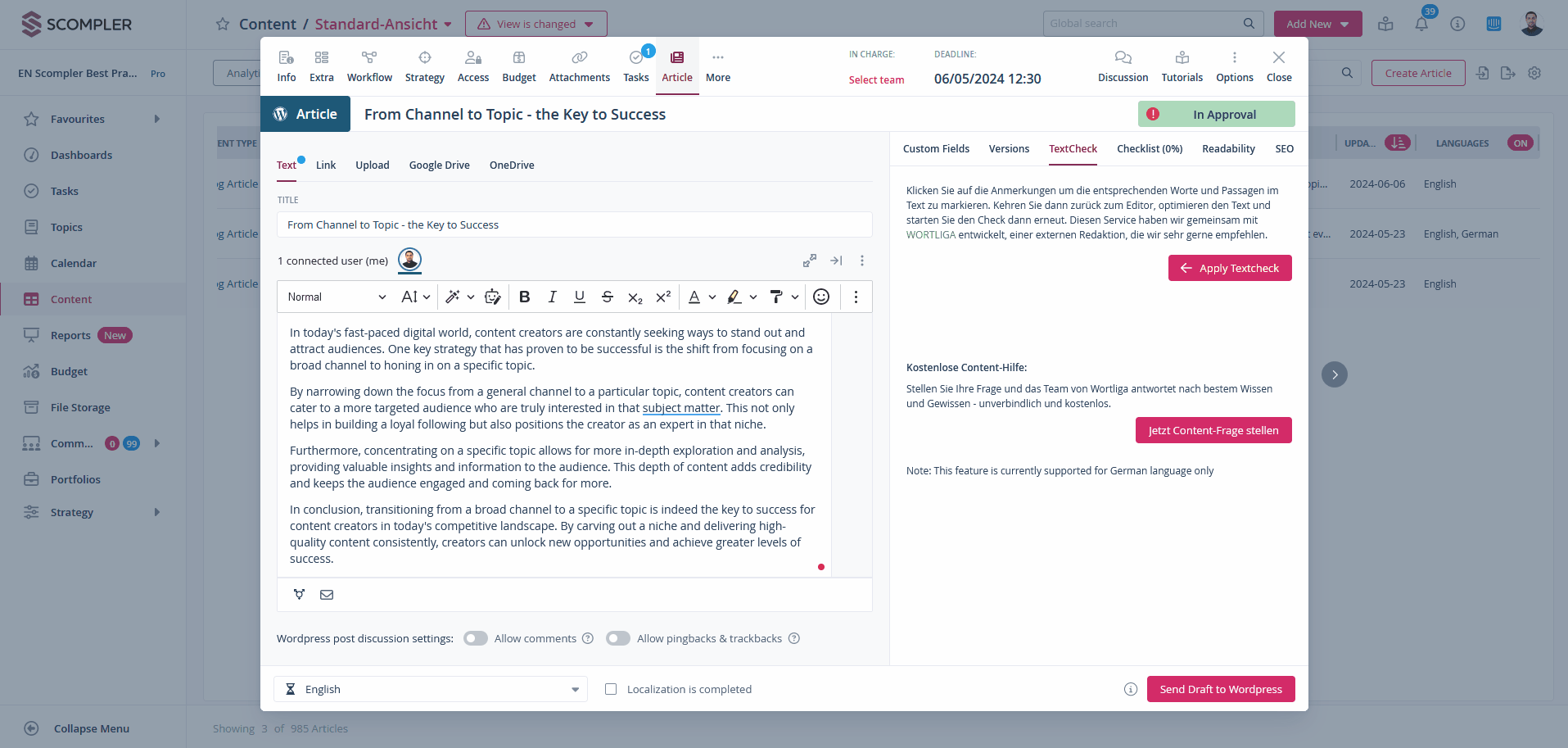 In all article editors, as well as in topics, stories, and article descriptions, you can use the AI-based assistant to adapt your texts to your target audience, format or tone. Find inspiration and much more with just a few clicks. You can recognize the assistant by the magic wand and robot symbol, which offers a variety of practical commands and the option of entering your own prompts. Further information can be found here.