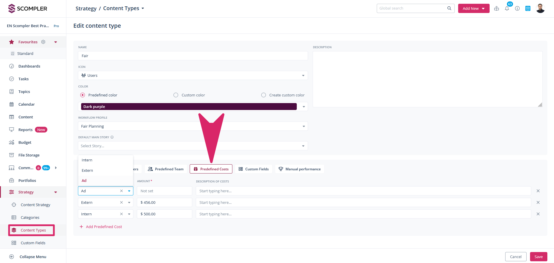 You can now define several standard costs for your content types and enter values. You can find out how to activate the budget function in your project here. This article explains the process for adding standard costs to your content types.