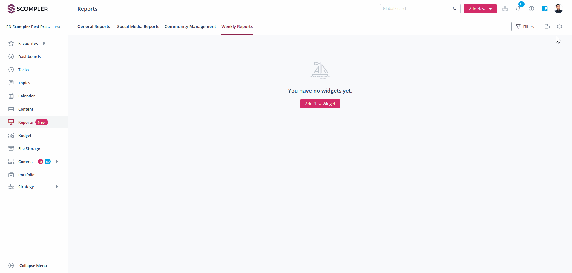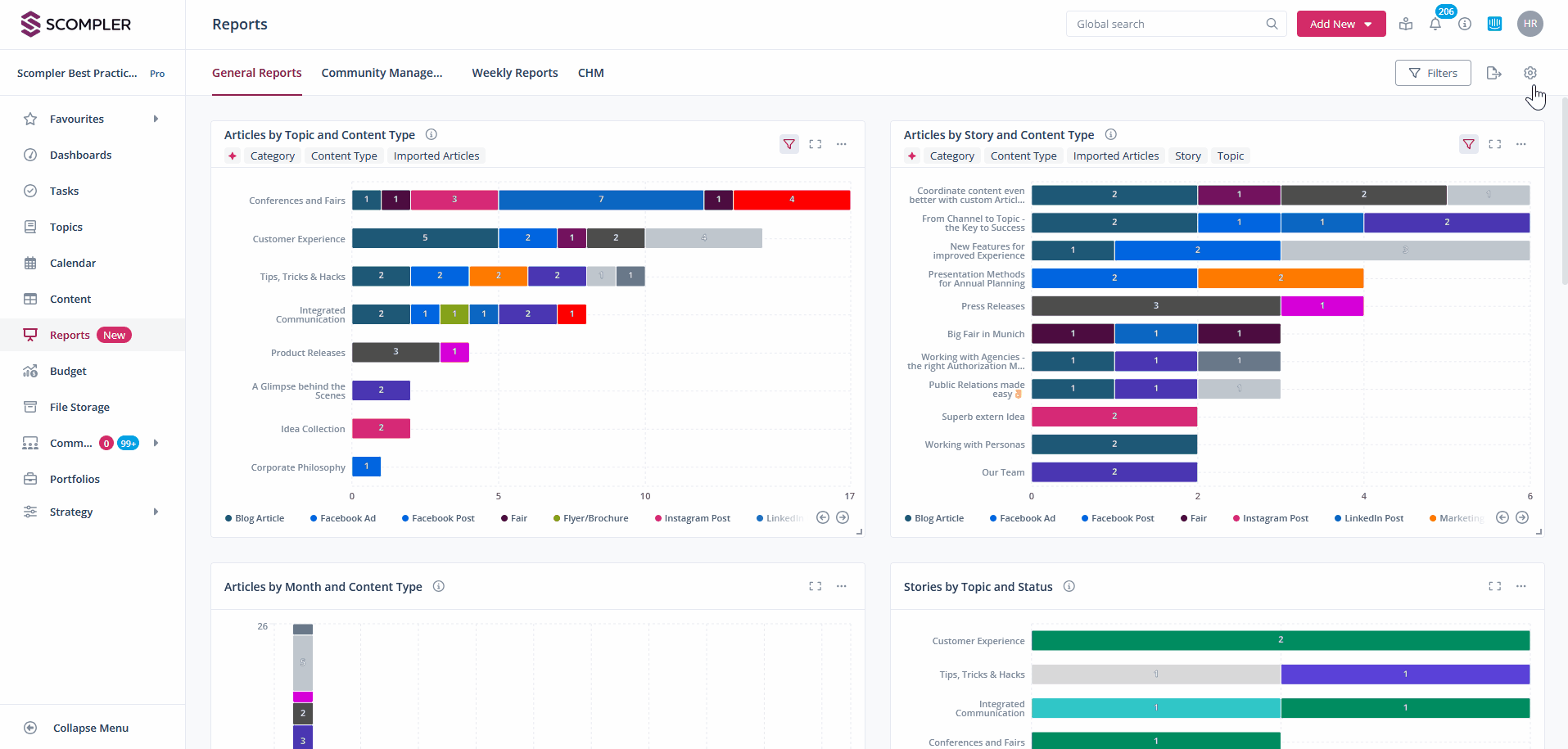 The Reports feature allows you to create individual evaluations of your articles, stories and topics. You can customize widgets and tabs to suit your needs and thus build a comprehensive reporting system.