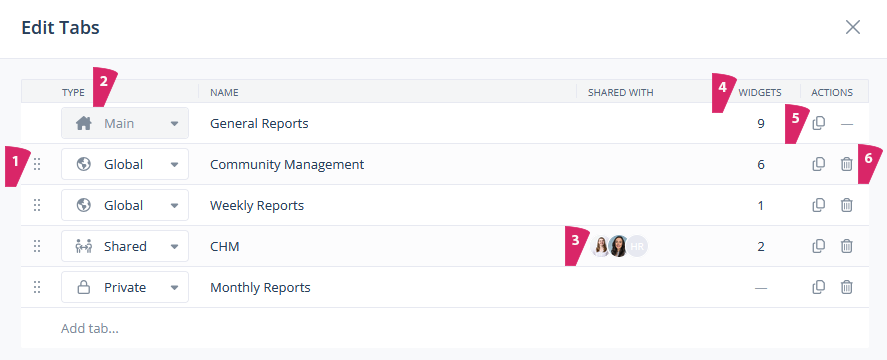 If you have several tabs, you can change the order of your tabs by simply dragging and dropping them (1). Under “Type”, you can set whether the tab is shared with everyone (Global), only with you (Private) or with a team or colleagues (Shared) (2). You can set the users with whom the tab is shared in the “Shared with” column (3). The current number of widgets for this tab can be found in the “Widgets” column (4). Tabs can be duplicated by clicking on the double document icon in the “Actions” column (5). Tabs that are no longer needed can be removed by clicking on the trash can icon (6).