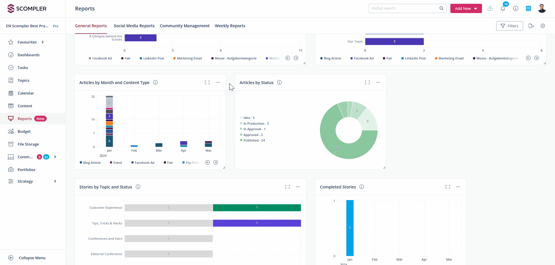 There are different widgets for analyzing articles, stories and the assigned strategy parameters. Bar and column charts are available for articles, which graphically display articles by topic, story, month and content types. The status of articles is displayed in a pie chart.