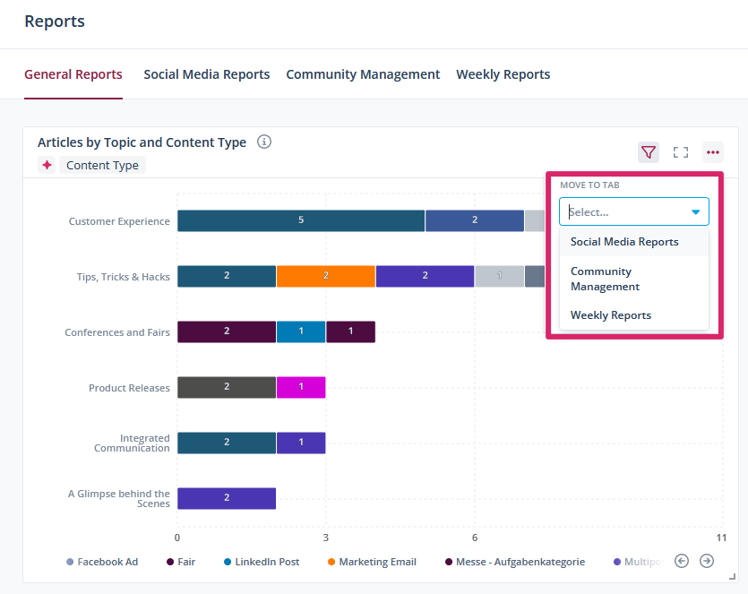 A good analysis of the planned and already communicated measures is the basis for a reliable evaluation and further planning. In the reports area, you can not only use various widgets to view your entire output quantitatively, but you can also answer specific questions in a targeted manner thanks to different perspectives and a wide range of filter functions.