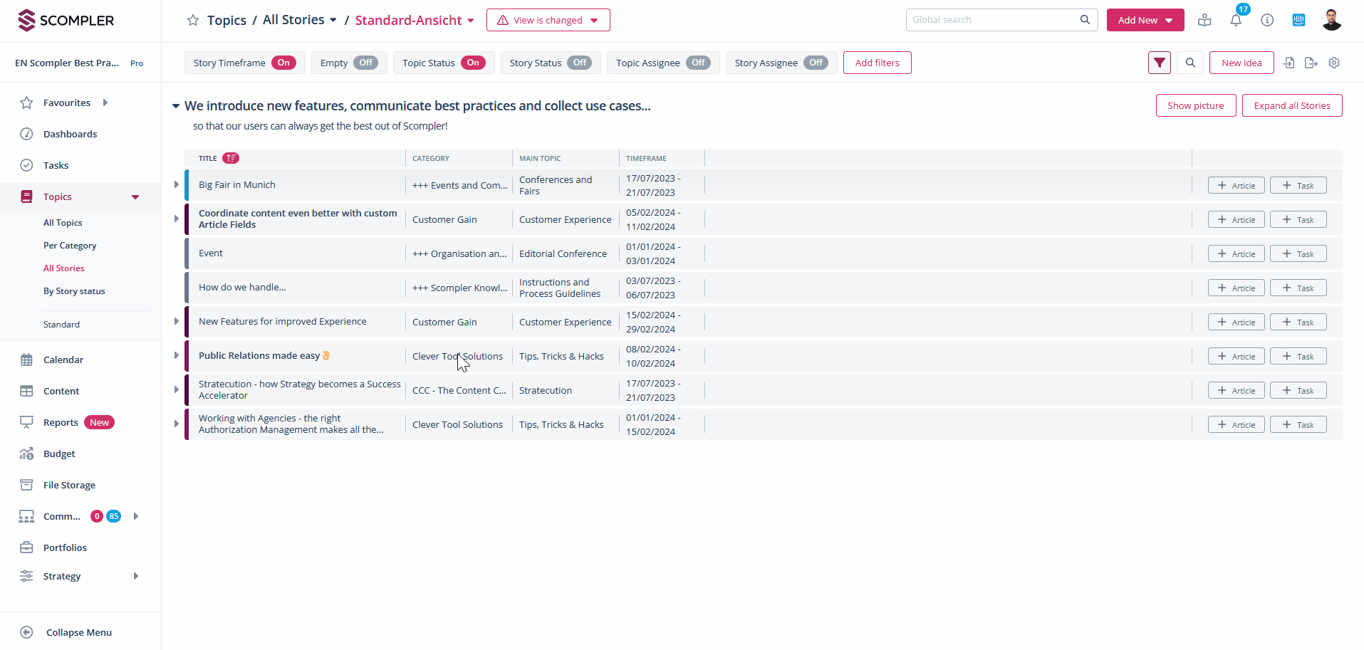 It can often happen that planned stories are not actioned and therefore need to be archived so they can be worked on at a later date. In such cases, it's necessary to have both an overview of the stories to be archived and of those that have already been archived. These stories are hidden in the standard views, but they can be displayed using filters.