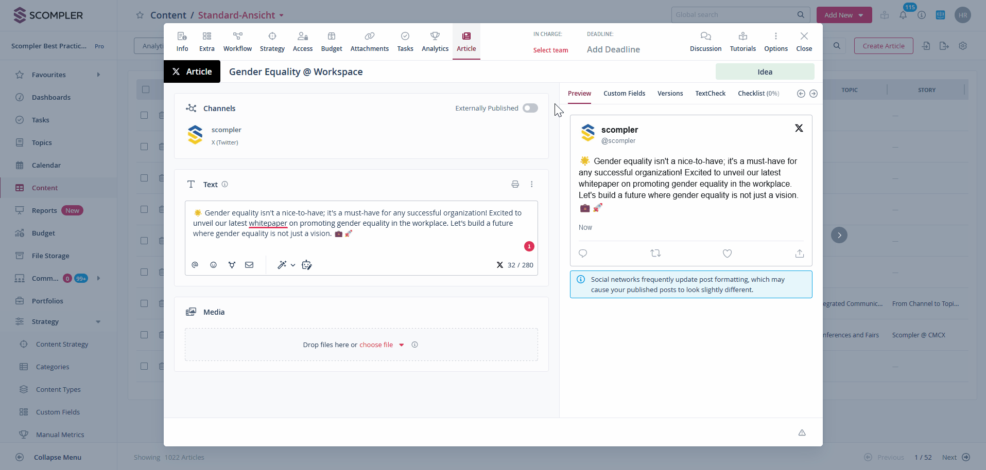 From now on, the analytics data of the post will be collected in the article and displayed in the “Analytics” tab and in the Reports. Additionally, a second preview will now appear in the preview tab on the right, which contains the content of the externally linked post.