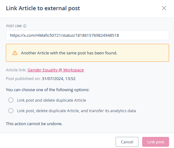NOTE: Please note that a post can only be linked to a single article in Scompler. If you try to link another article to the same external link, the following message will appear: